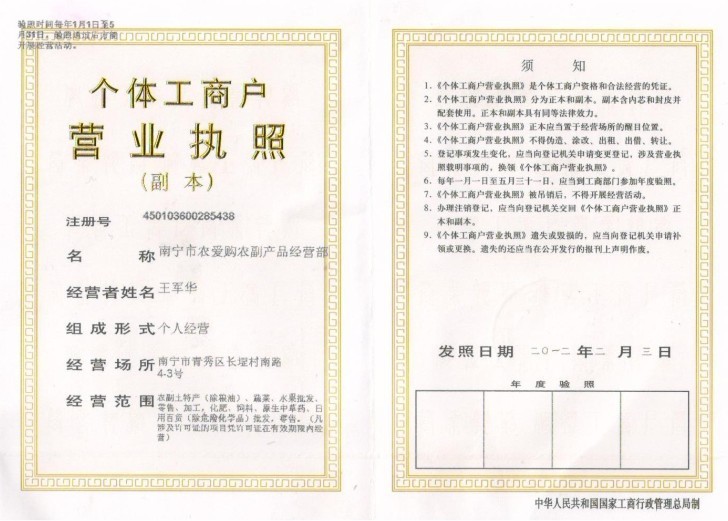 南宁市农爱购农副产品经营部,主营原材料:桑枝、木薯杆、玉米芯、按树皮,农作物:豆杆、花生杆、桔杆、虫粪、花生麸、花生壳、谷壳、米糠等系列,农副产品:龙眼、荔枝,香蕉、甘蔗、辣椒、八角等系列,原生中药材:牛大力。经国家工商部门批准注册,南宁市农爱购农副产品经营部具备桑枝、木薯杆、玉米芯、按树皮,农作物:豆杆、花生杆、桔杆、虫粪、花生麸、花生壳、谷壳、米糠等系列,农副产品:龙眼、荔枝,香蕉、甘蔗、辣椒、八角等系列,原生中药材:牛大力的招商代理资格。南宁市农爱购农副产品经营部优质的产品质量,广阔的市场前景,丰厚的代理待遇,强大的代理优势,让您创业投资不再难。南宁市农爱购农副产品经营部是热诚欢迎各位有志之士前来实地参观和考察。 [详细介绍]