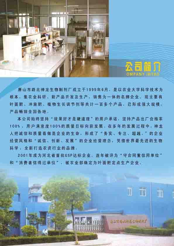唐山市路北神龙生物制剂厂成立于1999年6月,是以农业大学科学技术为根本,集农业科研、新产品开放及生产、销售为一体的名牌企业。现主要有叶面肥、冲施肥、植物生长调节剂等共计一百多个产品,已形成强大规模。产品畅销全国各地。 本公司始终坚持“效果好才是硬道理”的用户承诺,坚持产品出场合格率100%,用户满意度100%的质量目标向前发展。在多年的发展过程中,神龙人把诚信和质量看做是企业的生命,形成了“务实、专注、超越”的企业经营风格和“诚信、创新、发展”的企业经营理念,凭借世界最先进的生物科学,全新打造农资行业的品牌。 2001年成为河北省首批GSP达标企业,连年被评为“守合同重信用单位”和“消费者信得过单位”,被农业部确定为叶面肥定点生产企业。 我们的目标:做世界生物农业技术的领航者。 我们的使命:修身、齐家,兴司强国,取之社会,回报社会。 企业精神:求实、求新、求专、求信。 为人之道:团结、诚信、敬业、勤俭。 做事风格:认真、严格、主动、高效。 经营理念:应天、合作伙伴、员工“共赢理念” 服务理念:以专业的知识,真诚的态度,快速解决用户的问题,永... [详细介绍]