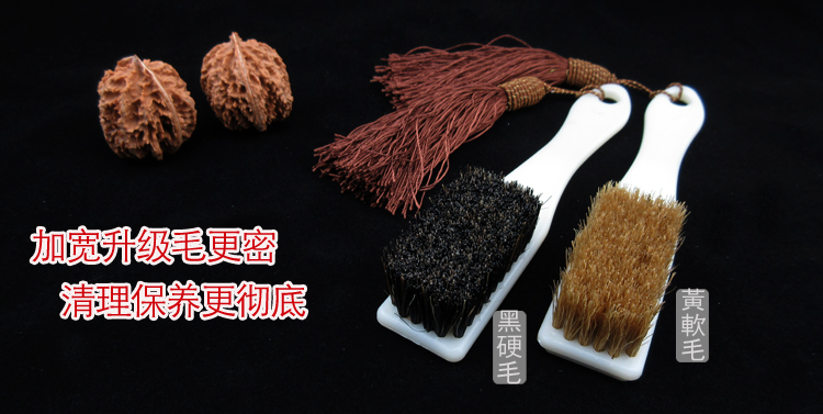 金刚核桃等喜油喜汗,夏天盘带**好,但是要多刷,鬃毛类****玩家都会选择把空隙里的残渣果肉清理干净了再盘,因上油多了会使色泽不均匀且发黑,所以玩家更喜欢多刷来上光上色,效果更自然也更简单。 其中黑色野猪鬃:又粗又硬,清理、打磨、抛光、上浆,前期用的更多些;黄色野猪毛:又密又韧,清理浮灰、去白碱、包浆、油润、养护,更适合已挂浆的核桃、金刚。使用过脏时可用洗发水清洁,洗后务必晾干,勿暴晒风吹,使用前可用一两滴文玩油润下刷子进行养护。