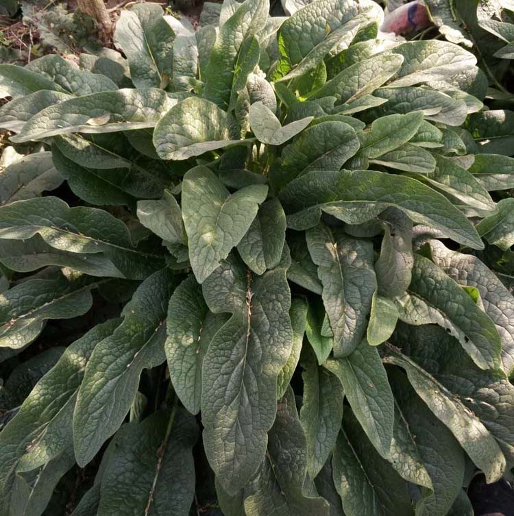 叶腋处有潜伏芽和分枝。茎的再生力很强,也能产生新芽和根,可育成新株。叶特别发达,可分为根生叶和茎生叶两种:根生叶数一般60~80片,最多可达200片以上,有长柄;茎生叶有短柄或无柄,向上渐小。叶片卵形、长椭圆形或阔披针形,长40~80厘米,宽10~25厘米,叶面粗糙,叶质肥厚,有刚毛。茎及分枝顶端生蝎尾状聚伞花序,花簇生,无限花序。花冠筒状,上部膨大呈钟形,淡蓝紫色或黄白色。有性繁殖能力较差,但也能结少量的种子。种子为小坚果,易于脱落。