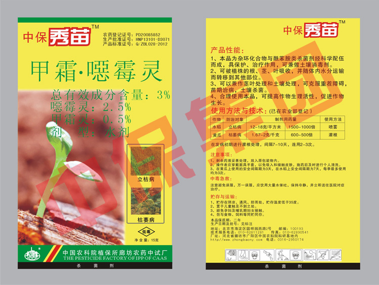 内吸性强,药效持久:本品能迅速被土壤吸收,与土壤中的无机金属盐发生相互作用而强力抑制厚垣孢子的萌发,其在土壤中的效力显著高于其他杀菌剂。本品可通过根系吸收并在植物体内迅速移动,从而发挥持久药效。