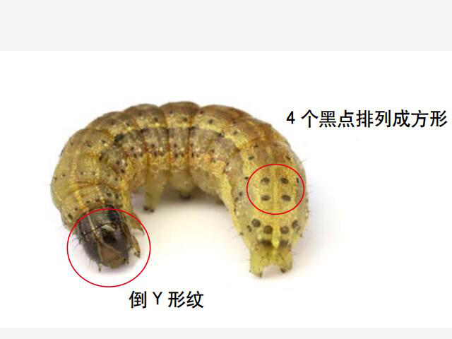 幼虫:普通有 6 个龄期,体长 1 ~ 45mm , 体色有浅黄、浅绿、褐色等多种 , 最为典型的识别特征是末端腹节背面有 4 个呈正方形陈列的黑点,三龄后头部可见的倒 Y 形纹。
