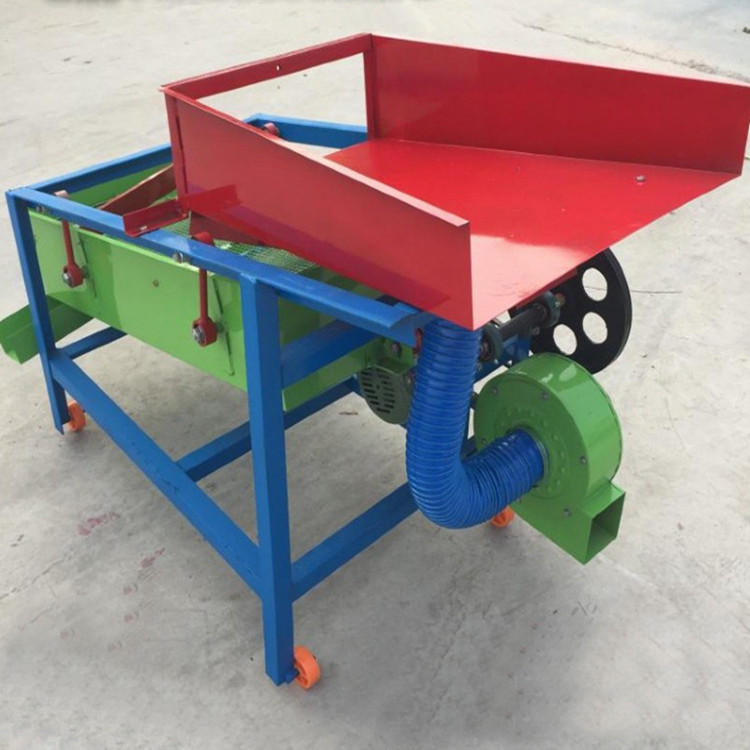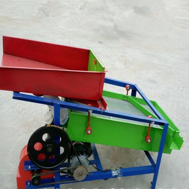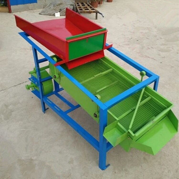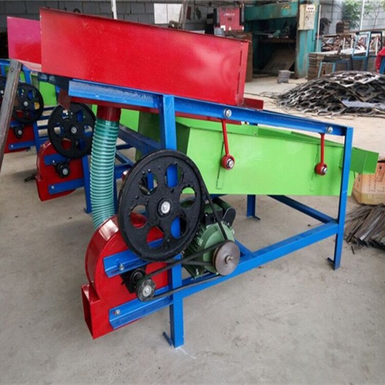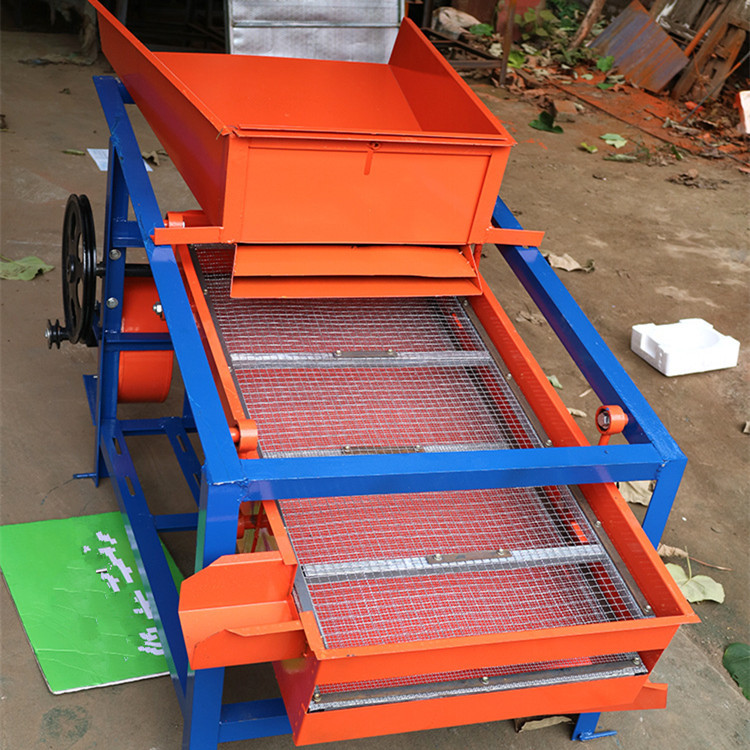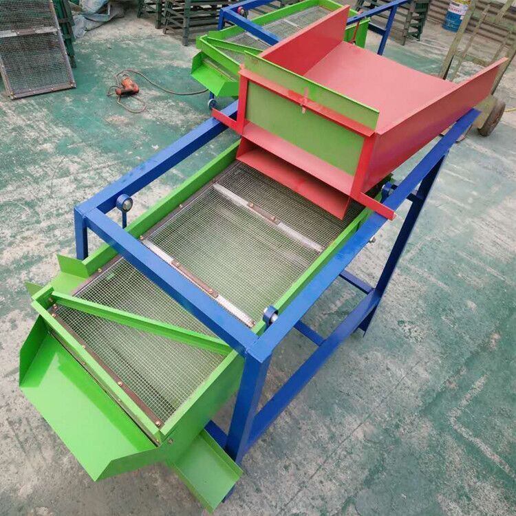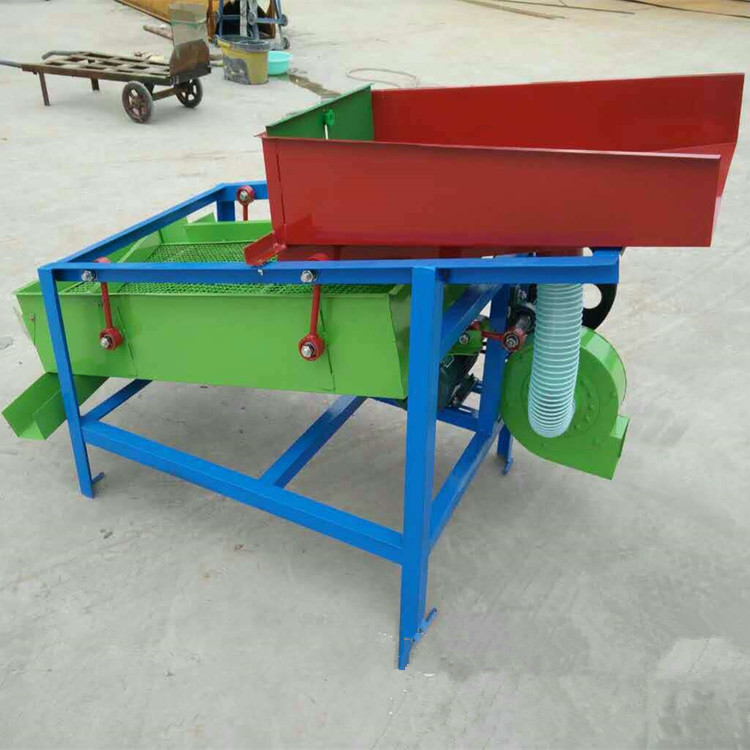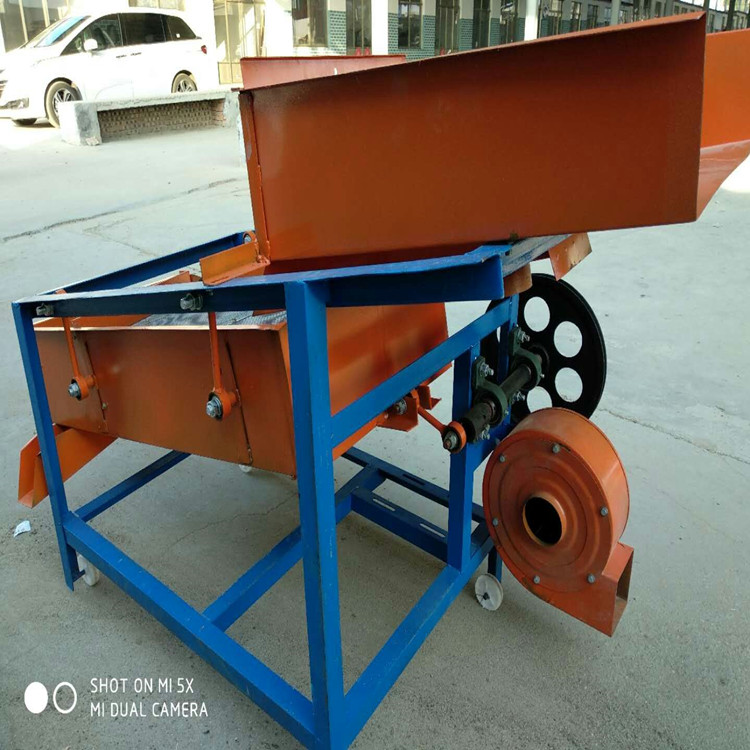 该精选筛为二层筛网,先经过进料口处风机抽风,直接抽走重量轻的杂叶或麦秸秆,上层筛的初次筛分再把大杂清理过,好的粮食(种子)直接落到下层筛网上,下层筛网会把粮食(种子)中的小杂.小石子.有缺陷的粮食(种子)直接漏掉,完好的粮食(种子)会从出料口筛分出来。该小型清粮机解决了扬场机的功能单一,不能有效去除石子.土块的缺陷,更能为清理、净选粮食(种子)带来满意的效果。该机有占地小,移动方便,便以维修,除尘除杂效率明显,能耗低,使用简便等优点。真可谓是中小型粮食清理净选筛中的战斗机!