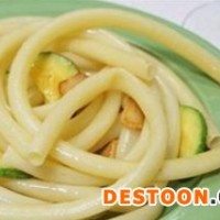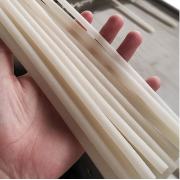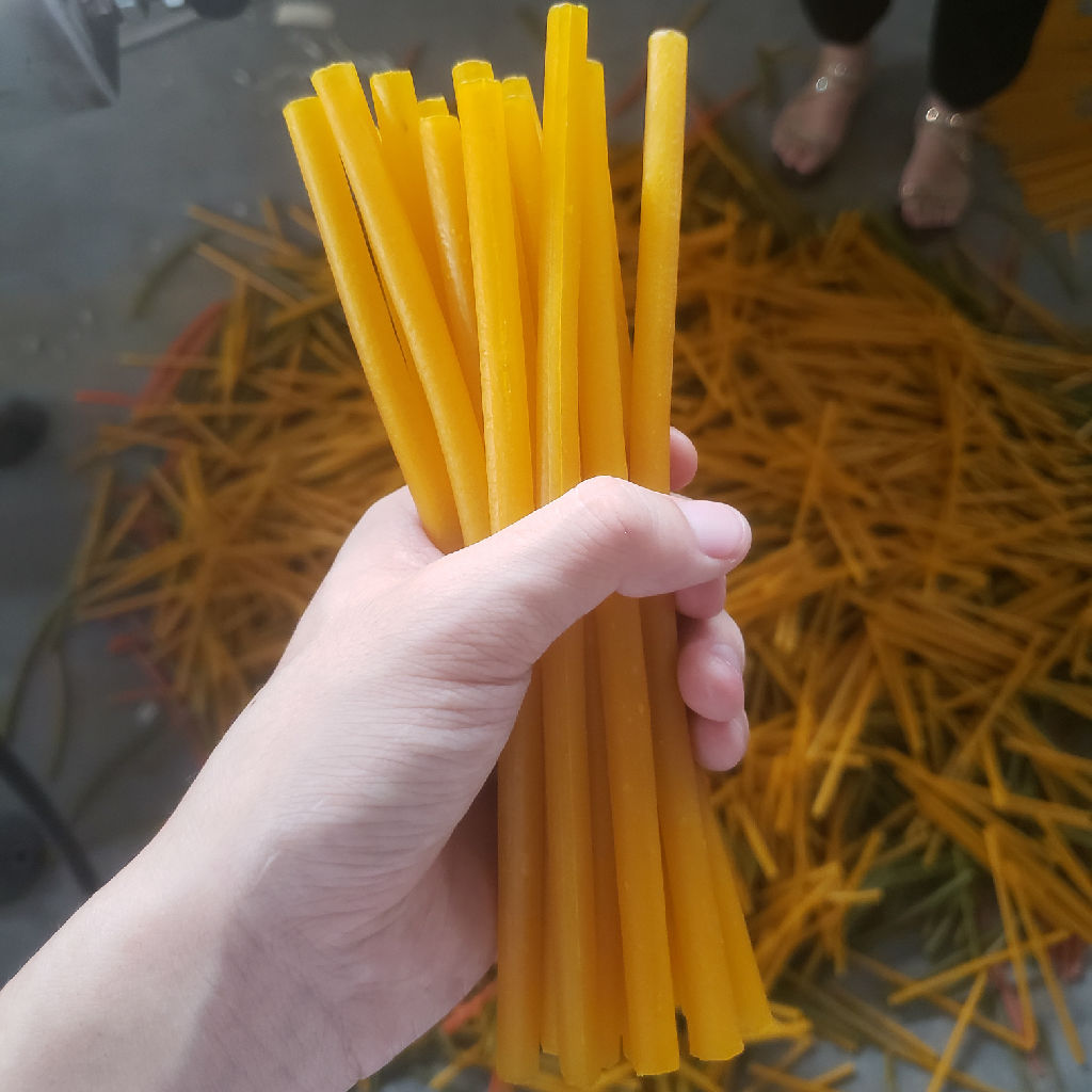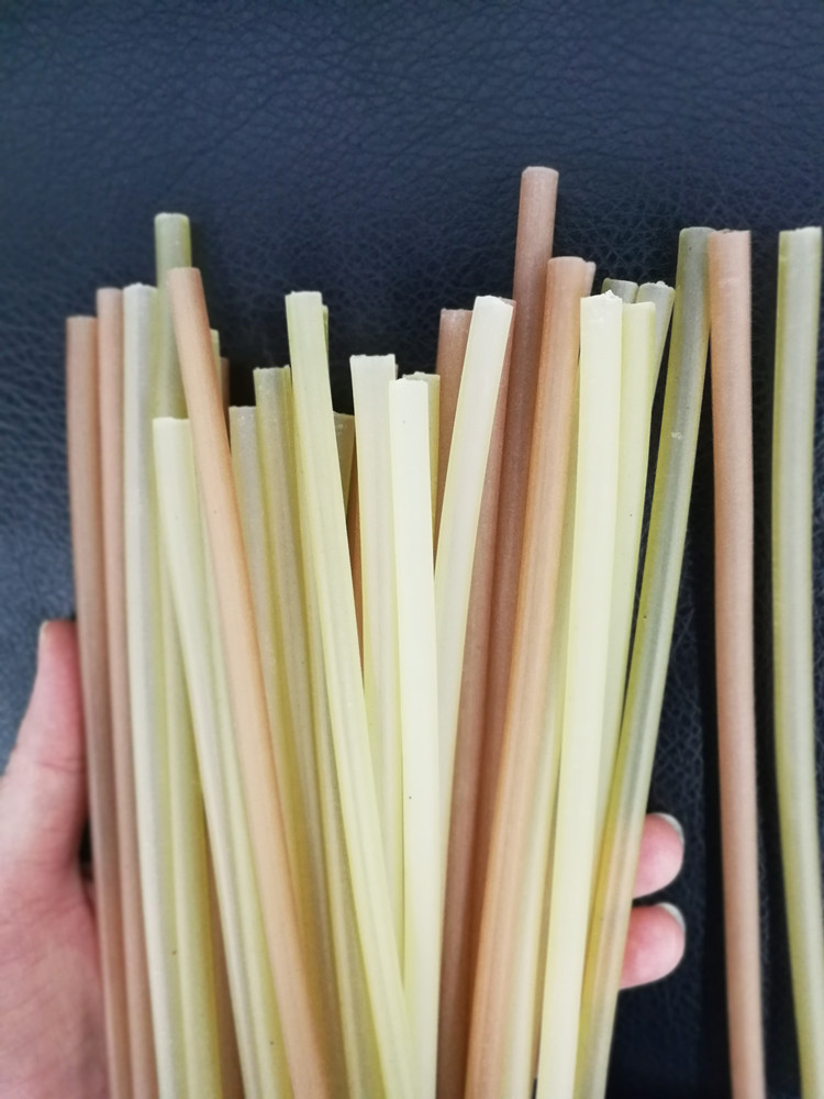 以面粉、玉米淀粉、木薯淀粉、马铃薯淀粉、马铃薯全麦粉等为原料,经双螺杆挤压机制成各种尺寸的坯料,再经烘干而成表面光滑、形状逼真的吸管。