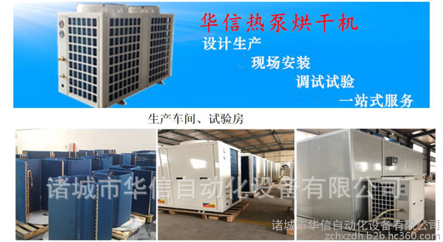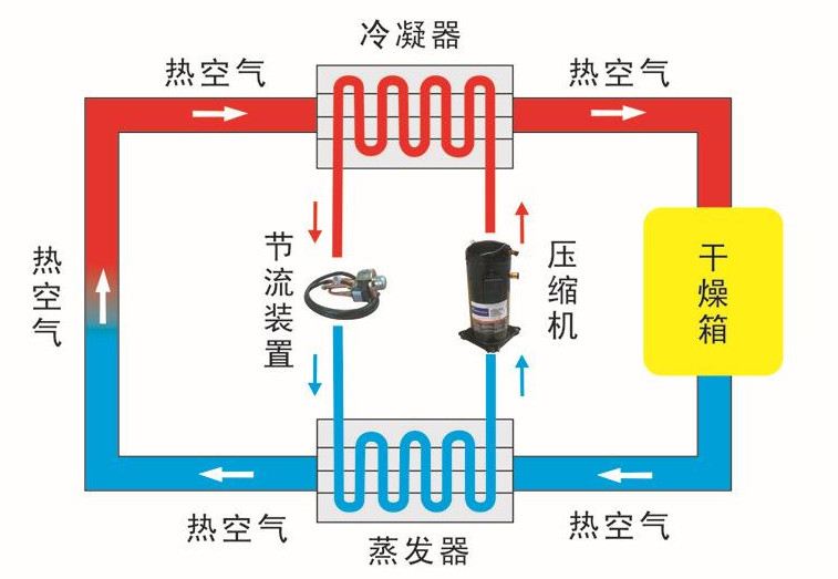 热泵烘干机是一种新型高效节能干燥机,其工作原理是根据逆卡诺循环原理,采用少量的电能,利用压缩机,将工质经过膨胀阀后在蒸发器内蒸发为气态,并大量吸收空气中的热能,气态的工质被压缩机压缩成为高温、高压的气体,然后进入冷凝器放热,把干燥介质加热,如此不断循环加热,可以把干燥介质加热至40℃~80℃。相对于电热干燥机而言,节约了三分之二的电能。