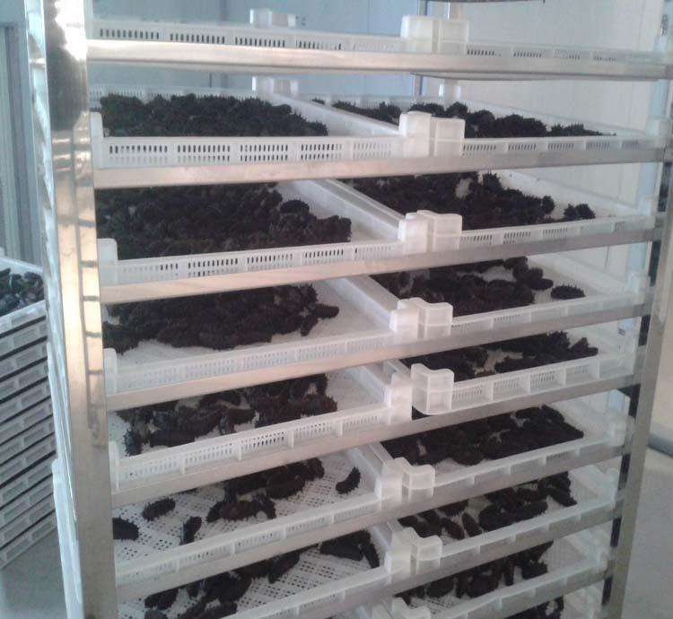 海参低温冷风干燥:海参*采用低温冷风干燥方式,我们采用1台3匹冷风干燥设备,循环系统风路结构采用侧循环方式,无死角循环,全闭式冷风除湿,一次可以放入300斤左右新鲜海参,设备温度区间可以调整5-80度之间,主设备每小时排水20斤左右,干燥过程需要50小时左右完成一个批次,海参干燥后的含水量稳定在13%左右。