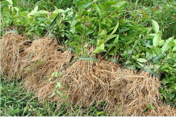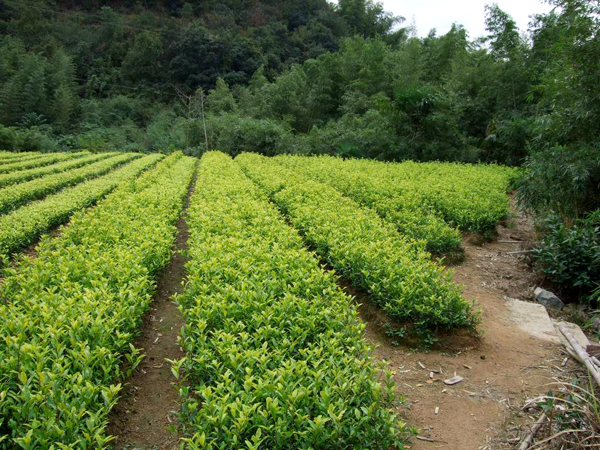 4.移栽和定植。在进行茶苗的移栽和定植时,将茶苗根部蘸以黄泥浆,采用单行栽植法在沟中每隔30-40cm栽苗2-3株。把根按生长方向摊放在培养沟中,然后填入土壤,再适当用脚踏实,上盖松土,留10-15cm不盖土,这样在定植初期能在未盖满土的沟中保蓄一些水分,提高沟中土壤湿度,有利于茶苗成活,以后地上表土受天然细微冲刷逐渐流入沟中,到沟差不多填平时,茶苗已度过炎暑时期,且土壤中的根系已较扎实,就不易遭受干旱的威协。栽种完成后用手悄悄提苗使茶树能天然扩展又不会使根须暴露,随后浇定根水。最好在茶树两边覆盖稻草或许编织布以保证土壤湿润。茶苗栽植后于4月中旬内行间隔茶行一侧35cm处开沟间作夏天绿肥壮叶猪屎豆。大叶猪屎豆培养初期生长较慢,后期生长快,至8月中下旬植株能高达120~150cm,主根入土深度达45-50cm,于9月中旬盛花期割青盖于茶园行间。大叶猪屎豆耐酸、耐瘠 、耐旱、产量高,且茎叶柔软、容易腐烂,植株高度适中,在茶行土壤表面的覆盖度大,在干旱季节能有用增加茶园土壤和空气的湿度,并能对茶树幼苗起到遮阴的作用,削弱激烈阳光的照射。