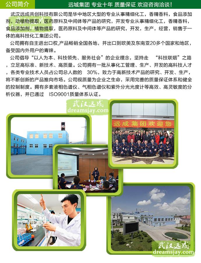 我们的优势:专业十年 公司投入巨资和人力用于研发适应市场需求的精细化工,生物化工,医药中间体等新产品,新工艺。高水平的研发团队**的实验设备,良好的科研氛围保证了研发实力, 公司主要生产东革阿里、去氧胆酸、氯化镁,硫酸铵、活性白土、左旋香芹酮、白藜芦醇、丙谷二肽、呋喃酮、金银花提取物、乙位突厥酮、积雪草总苷(积雪草甙)、香荚兰豆酊、异戊酸桂酯、己酸乙酯、3,4-二甲氧基苯甲醛(藜芦醛)、2,3,5,6-四甲基吡嗪、松油醇、氧化异佛尔酮、无水氯化钙、吲哚、芝麻酚、1,3-二甲基戊胺盐酸盐、1,3-二羟基丙酮、L-天门冬氨酸钠、单宁酸、单辛酸甘油酯、单月桂酸甘油酯、复合磷酸盐、甘氨酸钠、纳他霉素、尼泊金丙酯、尼泊金丙酯钠、尼泊金丁酯、尼泊金丁酯钠、尼泊金甲酯钠、尼泊金乙酯钠、乳酸链球菌素、山梨酸钾、双乙酸钠、松萝酸、硬脂酸钙、脱氢乙酸钠(脱氢醋酸钠)、辣椒红色素、胭脂红、叶黄素、栀子黄、丙二醇、亚铁**、BHA丁基羟基茴香醚、D-异抗坏血酸、D-异抗坏血酸钠、L-抗坏血酸棕榈酸酯、α-环糊精、表儿茶素、丙酸桂酯、茶多酚????等达100多种,其质量及技术含量均达到国内先进水平,预计年产值可达10亿元人民币。