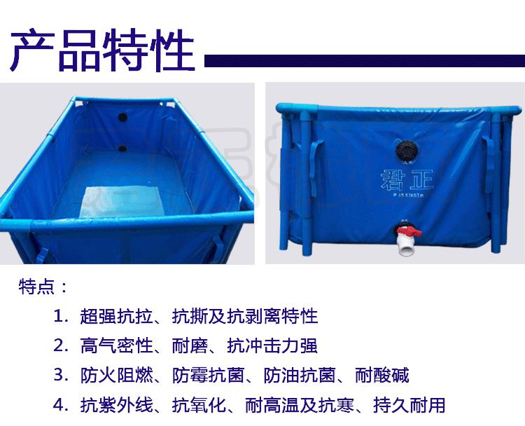 重庆君正橡胶制品有限公司以新型移动折叠鱼池(支架鱼池)为主导产品,采用橡胶合成纤维制造,橡胶合成纤维材料特点1、超强抗拉、抗撕及抗剥离特性2、高气密性、耐磨、抗冲击力强3、防火阻燃、防霉抗菌、防油抗菌、耐酸碱4、抗紫外线、抗氧化、耐高温及抗寒、持久耐用,采用国外先进技术生产.采用特殊热熔焊接工艺,支架采用国标pvc管制造,具有安装方便,不易渗漏,美观,耐用,耐磨,坚实不易大肚子等特点,适用于:暂养,新鱼转水,治疗,比赛,展示,繁殖等,和不方便建池的用户方便使用,优惠的价格,优质的服务继续致力于新产品的开发和生产,欢迎新老客户洽谈!