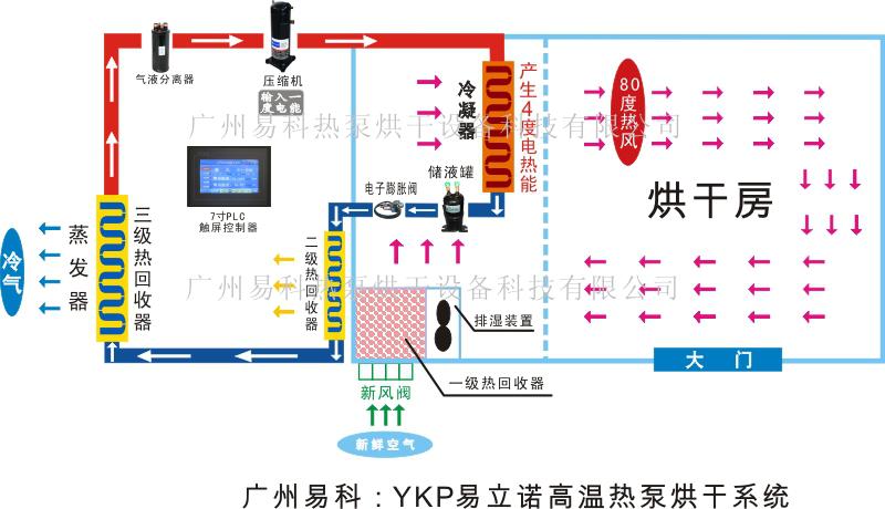 YKP易立诺空气能烘干机是利用逆卡诺原理,吸收空气中免费的热量并将其转移到烘干库房内,实现烘干房的温度提高,配合相应的除湿排湿设备实现物料的干燥。热泵干燥机由压缩机——换热器(内机)——节流器——吸热器(外机)——压缩机等装置构成了一个制冷剂循环系统。冷媒在压缩机的作用下在系统内循环流动,它在压缩机内完成气态的升压升温过程(温度高达120℃),它进入内机释放出高温热量加热烘干房内空气,同时自己被冷却并转化为流液态,当它运行到外机后,液态迅速蒸发吸热再次转化为气态,同时温度下降至-20℃~-30℃,这时吸热器周边的空气**会源源不断地将热量传递给冷媒。冷媒不断地循环**实现将空气中的热量搬运到烘干房内加热房内空气温度达到干燥物料的目的。