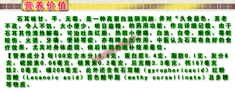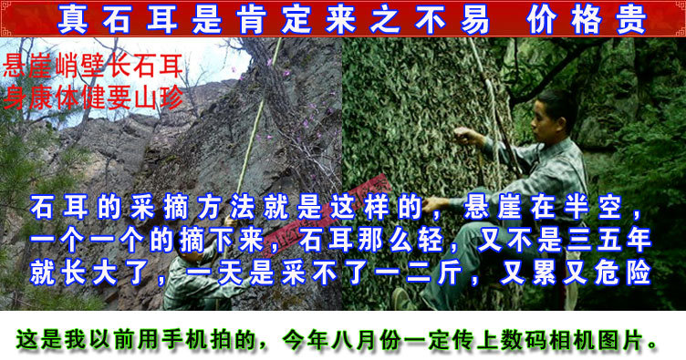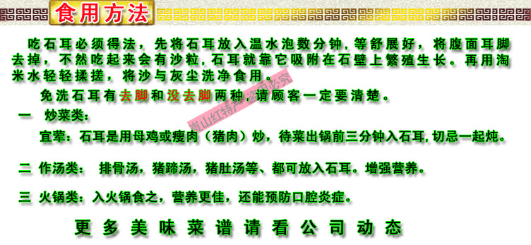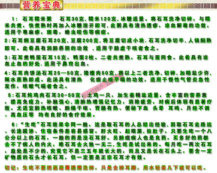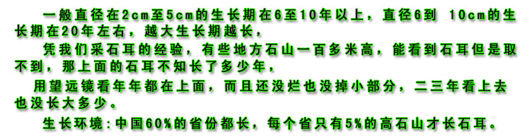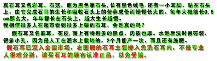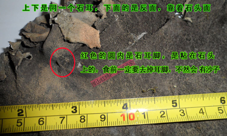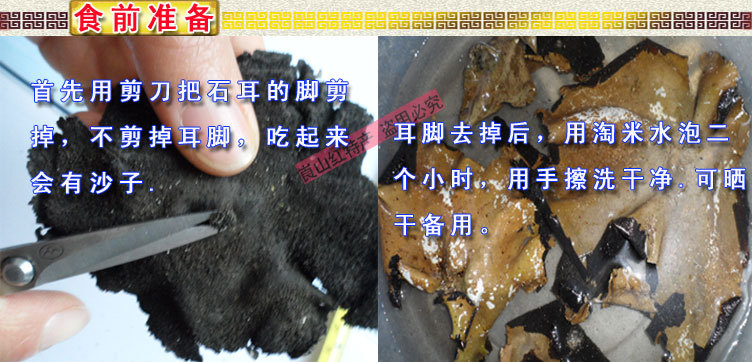 | 耳脚,一定去掉,石耳就靠它吸附在石壁上,繁殖生长。再用淘米水轻轻揉搓,将沙与灰尘洗净食用。 |