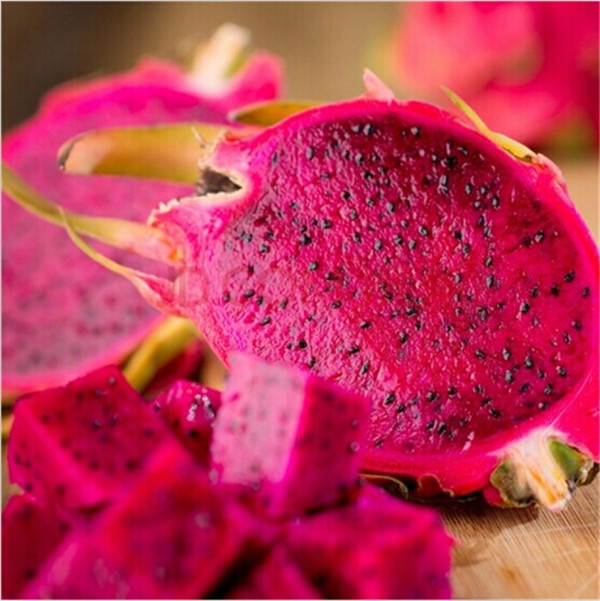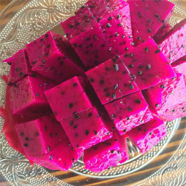 目前红肉火龙果品种名称混乱,没有确定的品种名,各种植者根据自己的爱好而定.红肉火龙果卵形、圆形、圆筒形,果皮鲜红色、有光泽,果肉红色或紫红色,细腻而多汁,含可溶性固形物16%-21%,单果重350-1000克。