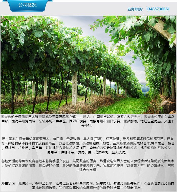 本网页所展示的有关【葡萄苗秋苗销售来电咨询_种业_寿光市鲁粒葡萄种植有限公司】的信息/图片/参数等由农产品之家的会员【寿光市鲁粒葡萄种植有限公司】提供,由农产品之家会员【寿光市鲁粒葡萄种植有限公司】自行对信息/图片/参数等的真实性、准确性和合法性负责,本平台(本网站)仅提供展示服务,请谨慎交易,因交易而产生的法律关系及法律纠纷由您自行协商解决,本平台(本网站)对此不承担任何责任。您在本网页可以浏览【葡萄苗秋苗销售来电咨询_种业_寿光市鲁粒葡萄种植有限公司】有关的信息/图片/价格等及提供【葡萄苗秋苗销售来电咨询_种业_寿光市鲁粒葡萄种植有限公司】的商家公司简介、联系方式等信息。