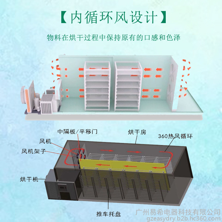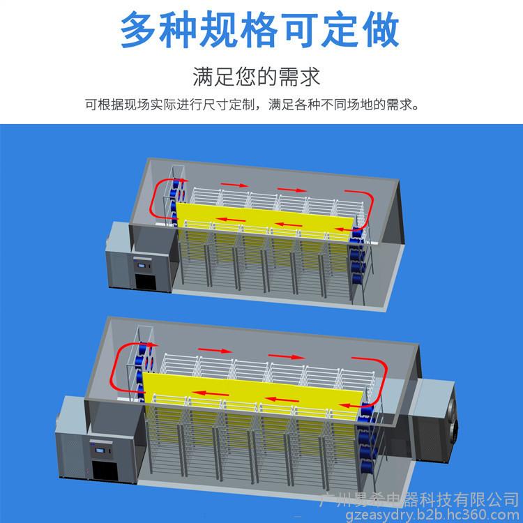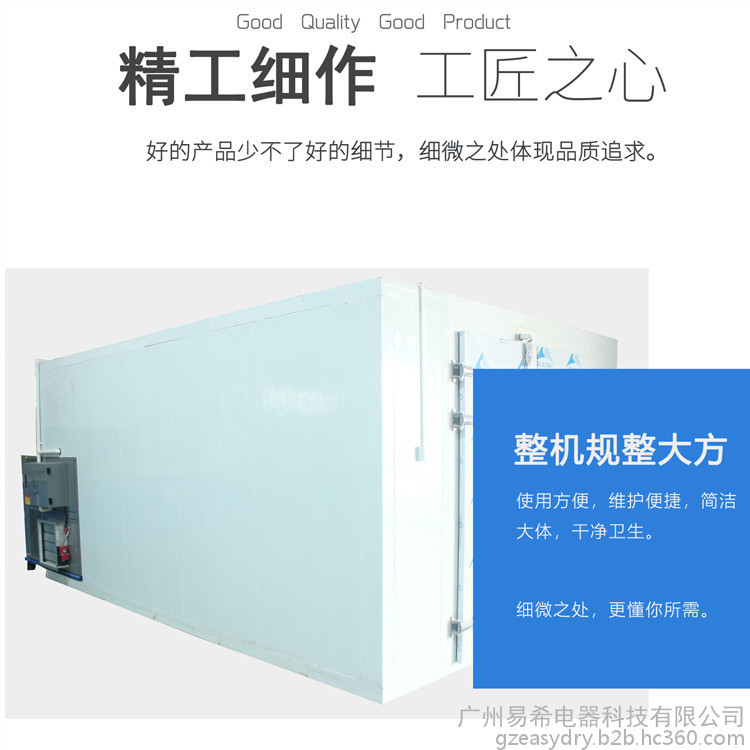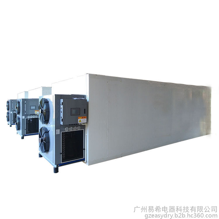 依靠电能吸收空气中的免费热量并将其转移到烘干房内(输入1度电能量能产生4度电热能),实现烘干房温度提高,配合相应的除湿设备实现物料的干燥。