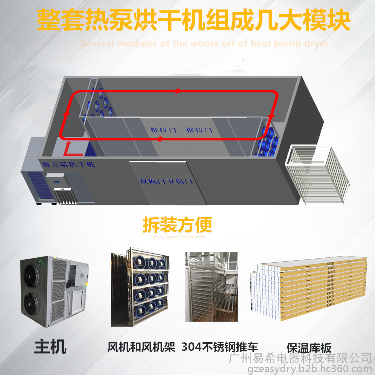 依靠电能吸收空气中的免费热量并将其转移到烘干房内(输入1度电能量能产生4度电热能),实现烘干房温度提高,配合相应的除湿设备实现物料的干燥。空气能热泵烘干机由压缩机,冷凝器(加热器),节流装置(电子膨胀阀),蒸发器(吸热器),压缩机等装置构成了一个制冷制循环系统。制冷剂在压缩机的作用下在系统内循环流动,它在压缩机内完成气体的升压升温过程,它进入冷凝器后释放出高温热量加热烘干房内的空气,同时自己被冷却并转化为流液态,当它运行到蒸发器后,液态迅速蒸发吸热再次转化为气态,同时温度下降。这是蒸发器周边的空气**会源源不断地传递给制冷剂,制冷剂不断地循环**实现空气中的热量搬运到烘干房内加热房内空气达到干燥物料的程度。