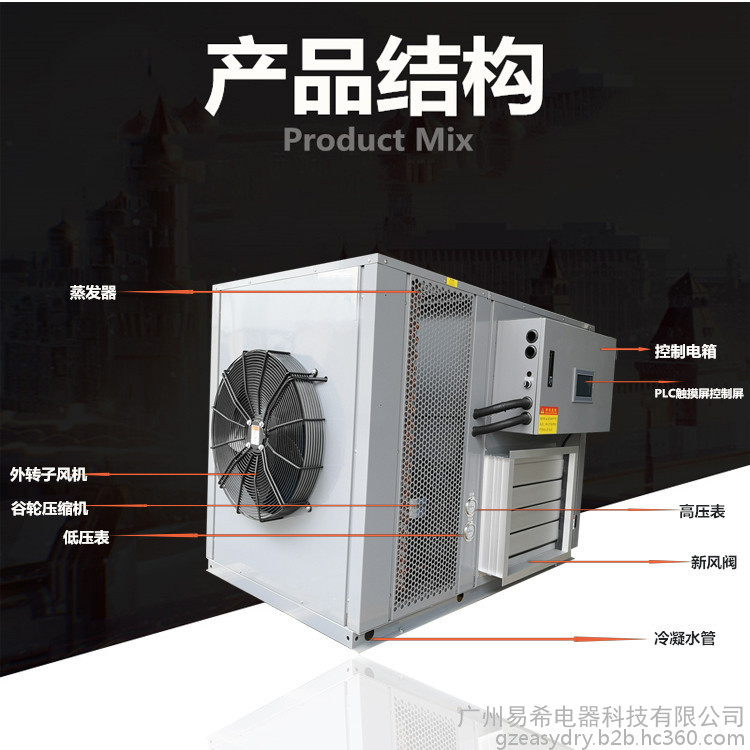 水蛭烘干机是一种高温热泵烘干机,本机通过压缩空气进行升温(烘干房内可调温度为:8℃-75℃,可调湿度:5%-95%),完全不用烧煤、不用烧柴、不用锅炉、不用蒸汽。水蛭烘干机只需要少量的电能来驱动压缩机**可以获得所需要的高温热量,整机安全卫生、环保、无污染、无废气排放,运行电费超低,全自动运行工作时无需人员值守,是一种节能环保的烘干解决方案。