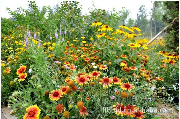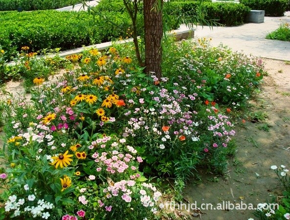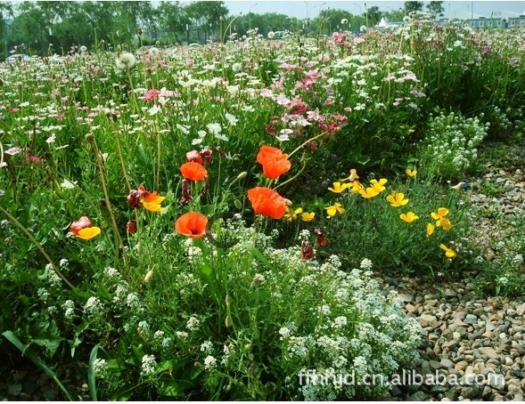 | 一、野花组合的特征介绍野花组合通常是由多种一、二年生草本花卉及多年生宿根花卉按照一定的配方混合组成的。其配方原则一般是根据应用地区的气候条件(如降雨、温度、湿度等)、海拔条件、土壤条件、花卉的生物学特性、生态习性以及应用目的、景观配置要求等,选用不同的花卉品种、种类以及不同的成分比例配合而成的花卉组合。 从景观需求上考虑,野花组合在进行种子配方混合时,一般都要求能达到花色范围最广、花期最长的目的。尽管自然界几乎没有整个生长季都开花不断的花卉种类,但人类却希望拥有常开不败的自然美景,野花组合作为一种造景因素也就因此而产生并兴盛起来。 配方混合的野花组合中通常包含了多种春、夏、秋三季开花的花卉种类,且花色丰富多彩,一般都包含有红、橙、黄、蓝、紫、粉、白及其他过渡色。这样一经种植,就可从春到夏、从夏到秋开花不断,美不胜收。尤其是大面积种植时,人们仿佛徜徉在花海,或是置身于原生旷野,可真切地感受到大自然的回归。二、野花组合的景观应用类型根据几年的研究,依据地域和用途综合划分为十种野花组合类型:1.以北京为代表地区的北方组合———北国风光该组合是由十余种一年生或多年生的花卉品种组成。其中一年生花卉多能自播繁殖,保证了景观效果的稳定性。该组合耐热耐旱,适合北方干旱少雨的生长环境。早春播种,当年即可开花,从春季贯穿到秋季,花开持续不断。由于该组合的花色丰富多彩,所以景观效果非常好。 2.以上海为代表地区的中部组合———烂漫江南 该组合是由十余种多年生或者具有良好自播繁殖能力的一年生花卉品种组成,景观效果长期稳定。该组合专门针对长江中下游流域冬季寒冷干燥、夏季高温高湿的气候特点进行配置而形成的。春播秋播均适宜,花期从春到秋,色泽明亮欢快。 3.以四川为代表地区的南方组合———西蜀风情 该组合由十余种多年生或具有良好自播繁殖习性的一年生花卉品种组成,植株高度错落有致。花色以红黄色系为主,明亮纯正。该组合在我国南方的春秋两季均可播种,花期贯穿春、夏、秋三季。它适合大面积种植,景观效果非常理想。 4.护坡组合———护坡花神(适合我国南方地区)、护坡卫士(适合我国北方地区) 护坡花神是专为南方地区配制的护坡组合。该组合的特点是耐旱耐热,耐贫瘠土壤,可粗放管理。 护坡卫士是专为北方地区配制的护坡组合。该组合的特点是耐寒耐旱,耐贫瘠土壤,可粗放管理。 这两种组合中的花卉为多年生或者自播繁殖能力强的一年生花卉品种。一次播种,可达到长期美化的效果。春季开花,盛花期在夏季,可一直持续到秋季霜降。花色简洁、鲜艳、明快,为护坡造景的绝佳选择。 5.绿茵飘彩———缀花草坪该组合的品种基本由宿根花卉组成,观赏效果长期稳定。大面积的草地上点缀清新素雅、充满自然情趣的小花,如点点繁星,展示出盎然的春意。整个景观可持续春、夏、秋三季。花色富有变化,从素雅到活泼,如同一张艳丽的花毯。 6.宿根组合该组合精选十余种宿根花卉组合而成,养护成本低,长期展现优美的景观效果。植株高低错落,花色艳丽。气候适应性广。北方地区春季播种,夏季开花;南方地区秋季播种,早春即可开花。花期持续春、夏、秋三季,是园林景观应用的上乘选择。 7.流星花园该组合由十余种具有很强自播繁殖能力的花卉组合而成。花卉的高度几乎都在70厘米左右,整齐美观。春季开始开花,夏季进入盛花期,一直持续到秋季。该组合的花色艳丽而富有变化,景观表现良好,非常适用于公园、高档住宅区。 8.湿地皇后该组合中的花卉品种均为宿根花卉,维护成本低,景观效果稳定。它是专门为湿地环境配制的组合。它的特点是耐湿润环境,但也具有一定的耐旱能力。开花从春到秋,花色素雅清新,景观效果简洁明快,是搭配水景应用的理想组合。 9.高尔夫组合该组合由十余种花卉组合而成,包含宿根花卉和一年生花卉。组合植株的整体高度中等偏低。春季开始开花,夏季进入盛花期,一直持续到秋季。花色丰富多彩,可为高尔夫球场的绿地增添动感与华贵。 10.林间花境该组合由十余种花卉组成,专门为光照不足的栽培环境特别配制。该组合只需一定的散射光线即可生长良好。可为暗淡的环境增添一片斑斓。春季开始开花,盛花期在夏季,可成片种植,也可间植于林间。组合景观效果稳定,可持续多年。 三、野花组合的成本费用野花组合在欧美国家已经研制并应用于景观布置中。组合的类型有很多种,如北方型、地中海气候型、海洋气候型、南方型、香花型、飞鸟型(主要能吸引飞鸟)、矮生型、湿地型等。 从总体上来讲,各种类型的野花组合一般播种量应控制在每平方米3.0至4.0克。除非有特殊的情况,否则应该避免超过最大播种量进行播种,因为这样容易在多雨季节形成植株徒长或倒伏,或者出现野花组合中多年生宿根花卉生长表现不良的现象。由于野花组合具有强健的生命力和很强的抗逆性、生态适应性,因此极耐粗放管理,日常管理费用极低。 四、野花组合的栽培技术1.种子净度和发芽率野花组合中,大多数种类的种子净度可达95%至99%。种子发芽率因花卉种类不同而有很大差异,但多数野花组合中种子的最小发芽率范围在40%至75%,实际发芽率范围在40%至90%,或者更高。