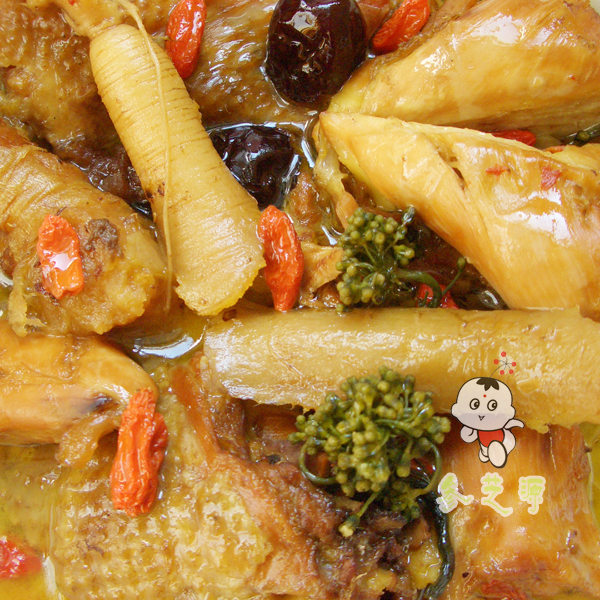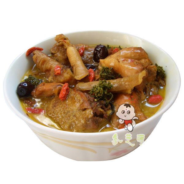 烹饪方法:将人参、枣、枸杞、当归等洗干净后装在老鸡的肚内,然后把鸡放进锅内,倒入水直至所有材料全部浸泡,用旺火来烹煮。沸腾后,将泡沫清除,继续文火煮3-4小时,直至鸡肉和里面的材料煮烂。最后,将鸡肉和汤一起盛在陶器锅内。注意,人参、党参、黄芪等材料必须放入幼鸡的肚内进行烹饪,因为只有这样才能让香味渗透到鸡肉内。