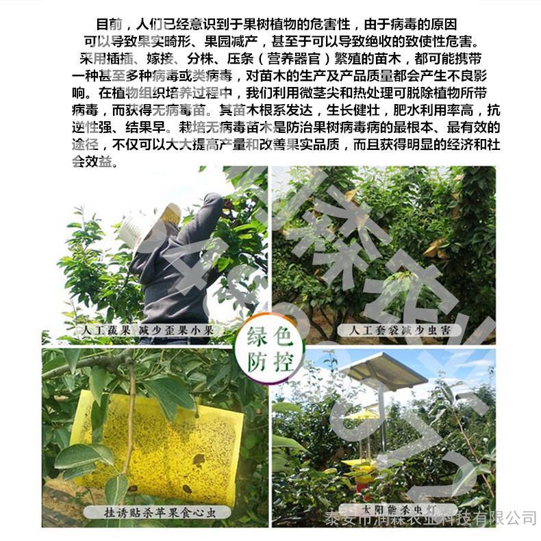 4、无病毒树需氮肥量少,抗逆性强。无病毒苹果树需肥量特别是氮肥量明显减少,无病毒树比带毒树减40%-60%,耐粗放管理,适宜在瘠薄土壤上栽培。