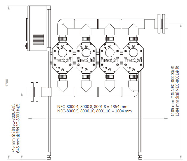 控制器1. 电源电压110-230V,可切换的频率50/60 Hz2. 基础电极电流1– 7 A可调节。次要电极电流0.25– 2.5 A可调节. **大15v输出电压。(每节0.25A的调节幅度)3. 消耗功率– NEC-8000.4, 8000.8, 8001.8:**大 1.5 kW– NEC-8000.5, 8000.10, 8001.10:**大 1.85 kW4. 壳体尺寸(宽 × 高 × 深)– NEC-8000.4, 8000.8, 8001.8:610 × 1700 × 1535 mm– NEC-8000.5, 8000.10, 8001.10:610 × 1700 × 1785 mm5. 已编程的开关周期上升为为每天3次6. 流速由turbine或者径向直叶风扇轮流量计控制,或 者感应流量计7. 保护等级54