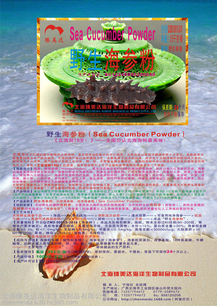 【产品名称】野生海参粉、天然海参粉、纯净海参粉、海参粉、海刺参粉(Wild Sea Cucumber Powder)。