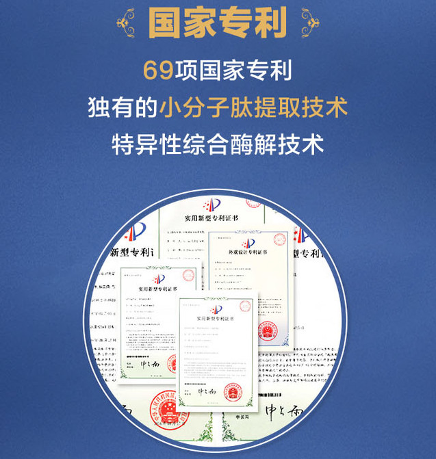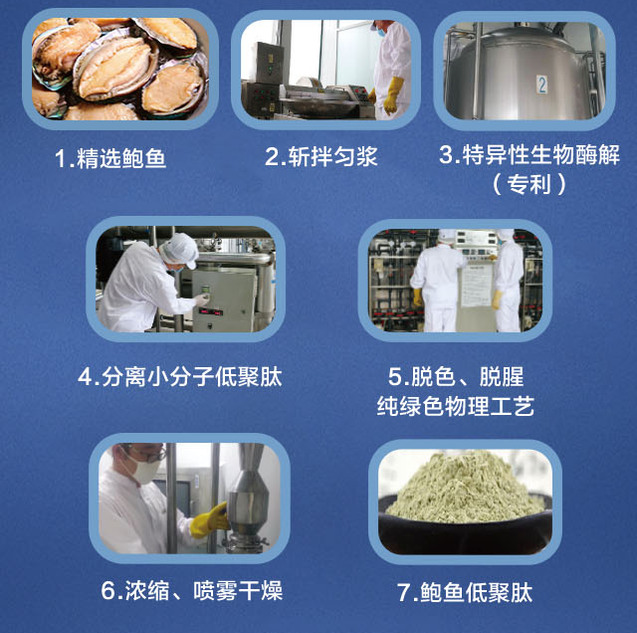 海参低聚肽是以北纬39°海域的大连有机辽刺参为原料,通过独有的酶工程技术,采用专用复合酶酶解得到。产品经食品质量监督检验中心检测分子量<1000Da占比达98%以上,同时含有丰富的胶原蛋白合成必须安基酸—羟脯氨酸。