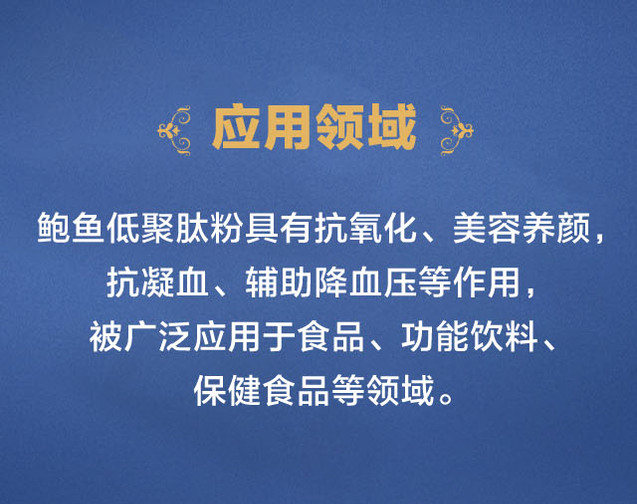 海参低聚肽可应用于功能性食品、保健食品、特医食品、化妆品等多个方面,尤其适合开发亚健康调节类产品,例如:辅助降糖类、增强免疫力类、抗疲劳类、补充胶原蛋白类、男性产品、护肤品等。