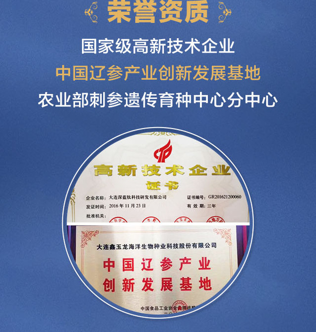 海参属棘皮动物,有6亿多年的存活史,《食物本草》记载,海参味咸,性温补,入肾经,生百脉血,补肾益精,壮阳疗痿,除劳祛痰,滋阴利水,补正软坚,通肠润燥,是自古以来的滋补佳品,具有极高的食用及药用价值。