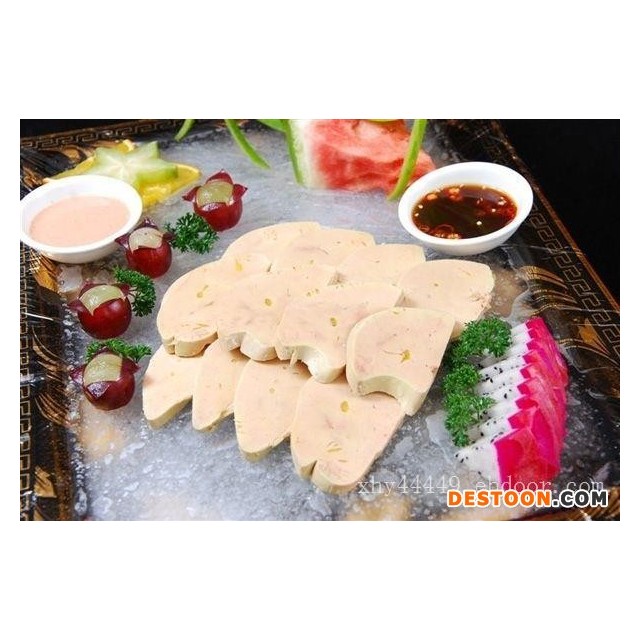 青岛法国鹅肝,鹅肥肝是一种珍贵食品,除前述各种因素外,加工技术的影响也可不忽视,采取特定的加工方法,才能获得最多质优的肥肝。1)屠宰。肥肝鹅的屠宰与肉用鹅的方法一样,值得注意的是放血时间要求5~10分钟,保证充分放血。浸烫的水温不宜过高,浸烫的时间约在3分钟左右,不宜过长。拔毛不宜用脱毛机,只适合手拔。2)拔毛。整个屠宰过程做到轻捉轻放,切不可挤压鹅的胸腹部,更不可相互挤压堆放。最根本的要求是不因放血不全,长时间的高水温浸烫,挤压和堆放因而影响肥肝质量。3)预冷。屠体洗净,腹部向上放在分层的金属架上,每层可并排放鹅5~7只,沥干水分后推入温度的0~4℃的预冷间,冷却停放18小时,使脂肪凝结,内脏变硬,以防含脂高的肥肝破损。4)剖胴。操作间温度最适宜在4~6℃左右,保持清洁卫生。将鹅胴体尾靠剖胴者,胸腹朝上平放在操作台上。剖胴者左手按胴体,右手持刀剖胴,可任意采用横向、纵向、开胸3种剖胴法打开胸腹腔,使内脏暴露。5)取肝。用刀使内脏与胴体的腹腔分离,取肝者双手插入腹腔轻轻托住肥肝,慢慢细心地纯性分离肥肝与脏器的连结部分。最重要的是保持肥肝的完整性和胆囊不破。胆囊一破应立即用冷水冲洗胆汁,直至干净为止。