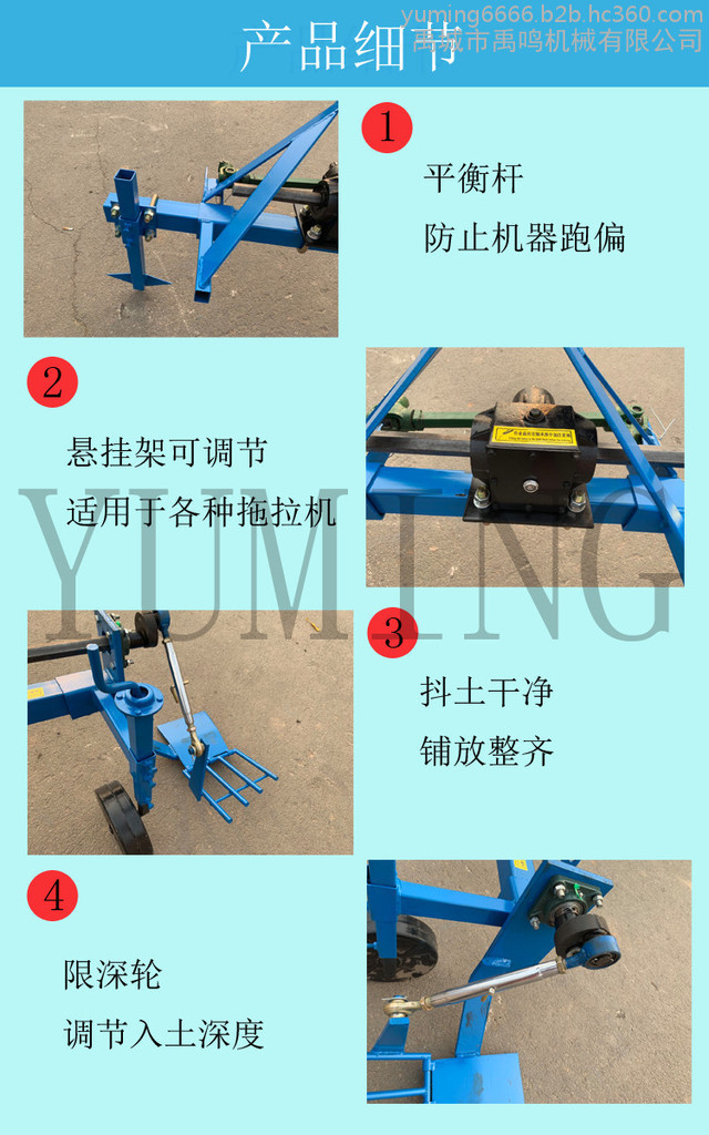 禹城市禹鸣机械制造有限公司是一家专业研发和制造的农机具的公司,公司现有员工55人,机加工设备30套,主要产品有耕作机械(圆盘犁,圆盘耙,铧式犁,旋耕机,深松机),种植机械(小麦播种机,玉米播种机,土豆播种机,蔬菜播种机),植保机械(自走式喷药机,拖拉机背负式喷药机,中耕机,松土机,起垄机,果园弥雾机),收获机械(马铃薯收获机,洋姜太子森收获机,石头捡拾机,甘蔗剥叶机,小型麦稻收割机,水稻插秧机),林业机械(植树挖坑机),牧草机械(往复式割草机,弾齿式搂草机,圆盘式搂草机)撒肥机,耙片,犁片,松土铲等各种农业机械及配件。另外公司还承接各种来图来样加工业务。我们以周到的服务,精良的工艺可靠的产品质量深受广大客户的厚爱,产品以外向型为主,主要出口南美洲,非洲及俄罗斯和东南亚的30多个地区。公司秉承:"以人为本,客户至上"的管理理念为广大客户提供服务。
