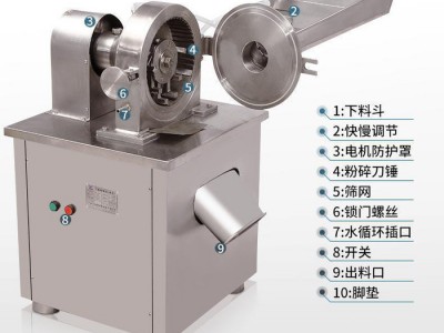 机器特点: 1、结构简单,粉碎腔装拆简便,容易清理。 2、本机为全不锈钢制造,符合GMP的要求。 3、运转平稳,噪音小,震动小。 4、操作简单。更换筛网可以控制出粉细度。 5、因为水冷式的结构决定了筛网面积缩小,只有普通齿盘式粉碎机筛网的40%左右,所以决定了水冷粉碎机的出料更慢,这点请客户注意。 6、用于冷却的水温越低,冷却效果越好。用于冷却的水,不可以循环使用,以免影响冷却效果。夏天用 井水比自来水的效果好,能够用加冰的水,效果更佳。