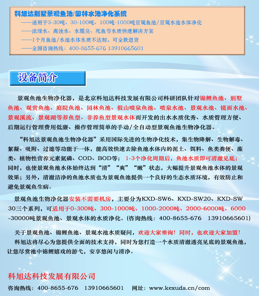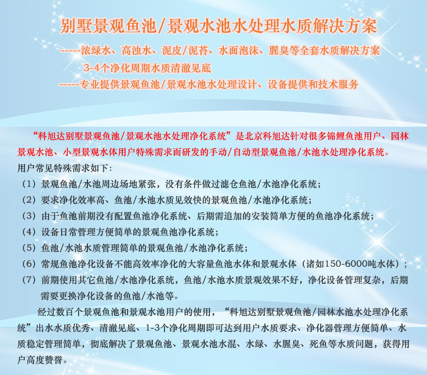 锦鲤的食性杂,又是冷水鱼,对温度、喂食的要求不高。,科旭达景观鱼池水处理水质解决方案,实施简单方便,可用于各种新建和改造景观鱼池和景观水池水处理工程;,锦鲤鱼在所有观赏鱼中属于很好养的鱼种之一。,景观鱼池生物净化器,解毒功能强,可有效防止鱼生bing和死亡!景观鱼池生物净化器,除藻效率95%以上,大幅降低鱼池水体色度,水体观赏效果好,景观鱼池生物净化器,解毒功能强,可有效防止鱼生bing和死亡。景观鱼池生物净化器,除藻效率95%以上,大幅降低鱼池水体色度,水体观赏效果好,景观鱼池生物净化器,除藻效率95%以上,大幅降低鱼池水体色度,水体观赏效果好!锦鲤鱼在所有观赏鱼中属于很好养的鱼种之一。。北京科旭达科技还提供各种园林景观水处理设计方案、过滤设备。欢迎用户来电咨询。,物理过滤主要的是清除能看的见、不溶于水的物质。通俗来讲**是:将水中的不溶解物质、废物过滤出来。,科旭达景观鱼池水处理水质解决方案,实施简单方便,可用于各种新建和改造景观鱼池和景观水池水处理工程;,物理过滤主要的是清除能看的见、不溶于水的物质。通俗来讲**是:将水中的不溶解物质、废物过滤出来。,“科旭达景观鱼池水处理净化”水质解决方案采用国际先进的“生物净化+生物过滤”多维立体技术。,科旭达景观鱼池生物净化器,真正实现了净化、解毒、曝氧、杀菌、灭藻五大功能于一体;。完善的过滤系统对锦鲤鱼池水质非常重要性,科旭达景观鱼池水处理水质解决方案,实施简单方便,可用于各种新建和改造景观鱼池和景观水池水处理工程;,物理过滤主要的是清除能看的见、不溶于水的物质。通俗来讲**是:将水中的不溶解物质、废物过滤出来。,科旭达景观鱼池生物净化器,真正实现了净化、解毒、曝氧、杀菌、灭藻五大功能于一体;,“科旭达景观鱼池水处理净化”水质解决方案,科旭达景观鱼池生物净化器,真正实现了净化、解毒、曝氧、杀菌、灭藻五大功能于一体;,“科旭达景观鱼池水处理净化”水质解决方案,