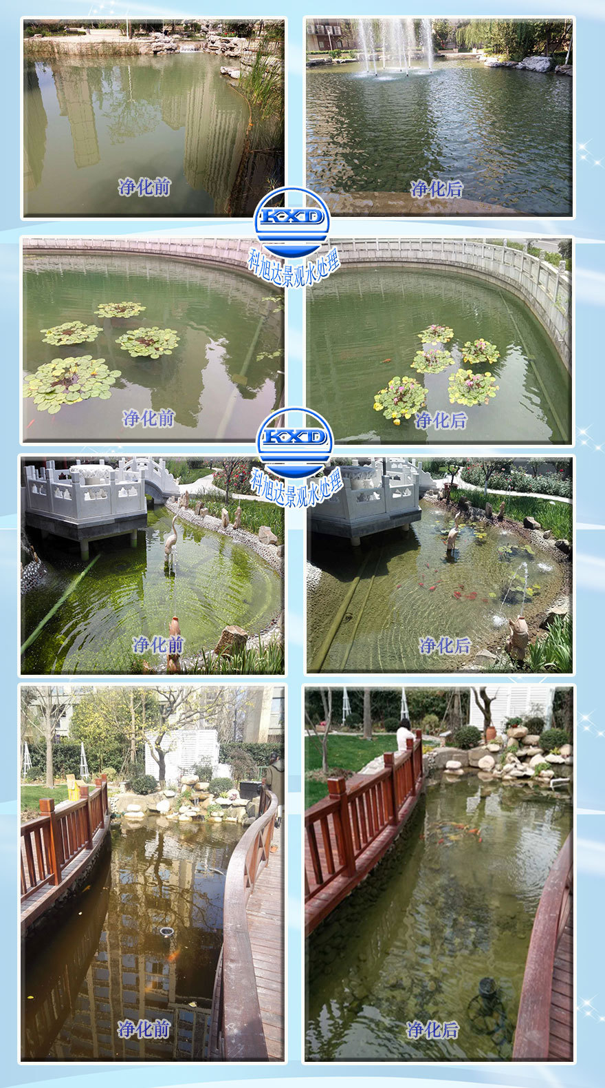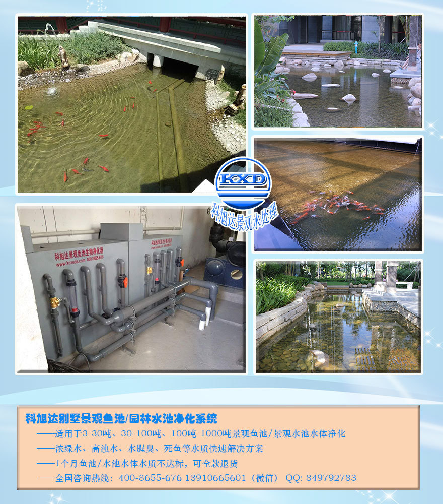 锦鲤池水净化科旭达锦鲤鱼池水质解决方案,水质“清”“爽”“嫩”,为锦鲤提供优质的水质环境,北京科旭达专业从事锦鲤鱼池、景观鱼池、景观水池、景观湖水处理,提供水绿水混水腥臭死鱼等水质解决方案,3个净化周期水体水质清澈见底。