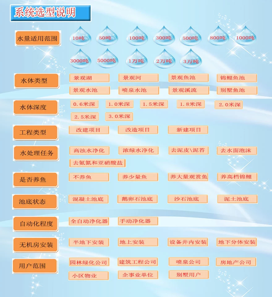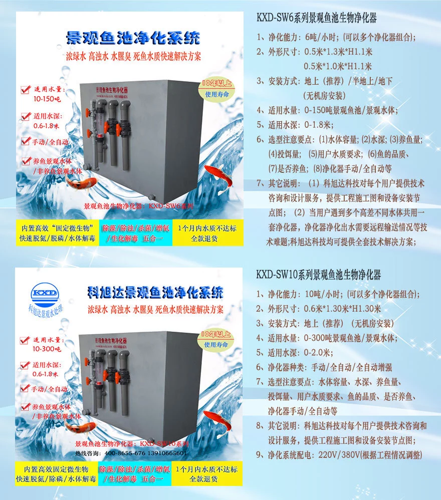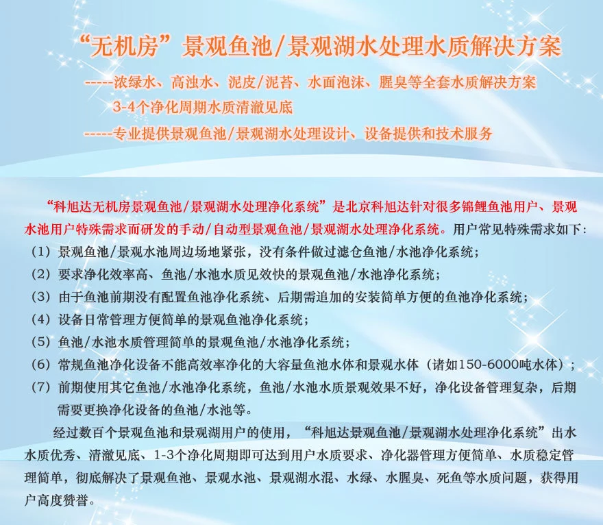 锦鲤鱼在所有观赏鱼中属于很好养的鱼种之一。。景观鱼池生物净化器,除藻效率95%以上,大幅降低鱼池水体色度,水体观赏效果好。北京科旭达科技还提供各种园林景观水处理设计方案、过滤设备。欢迎用户来电咨询。。景观鱼池生物净化器,除浊率98%以上,能见度≥1.5米,鱼池水质清澈洁净。科旭达景观鱼池生物净化器简要说明,科旭达景观鱼池生物净化器简要说明,