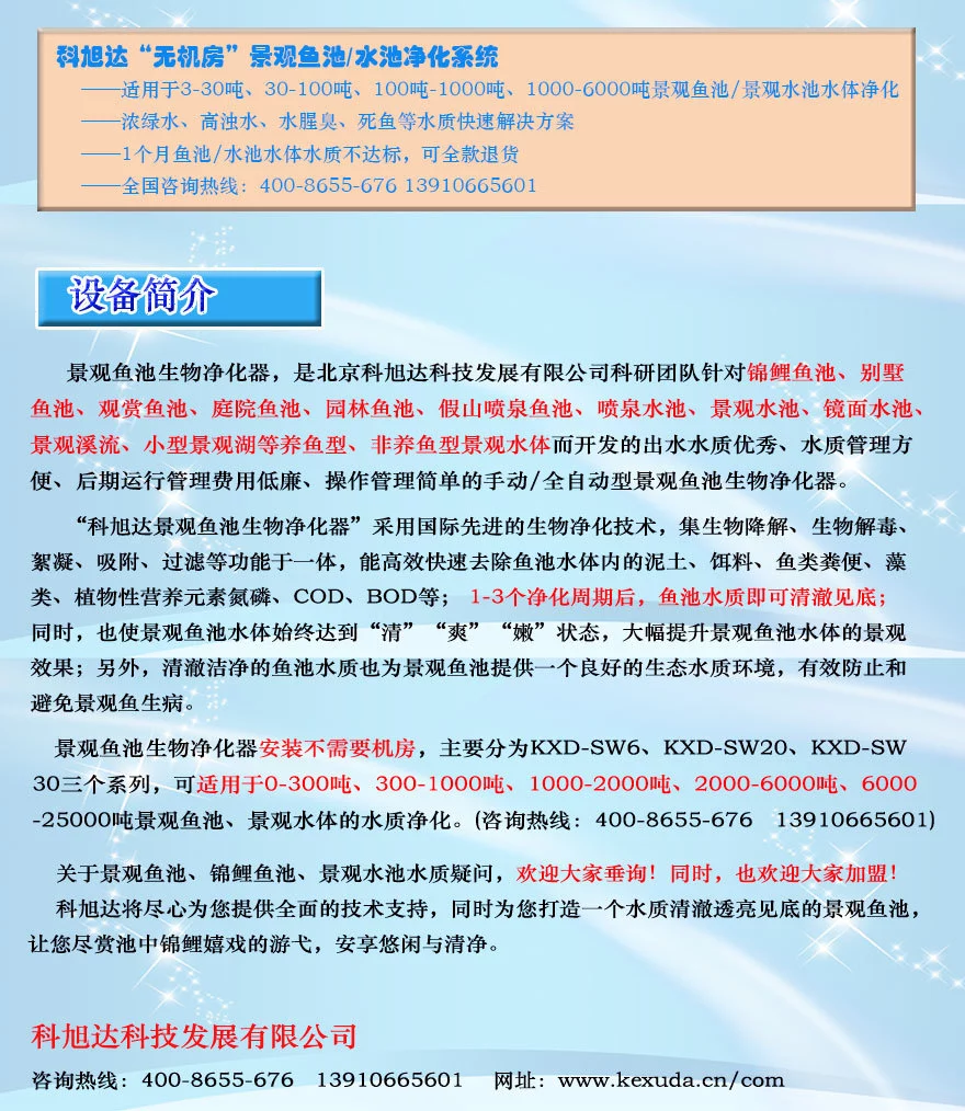北京科旭达科技发展有限公司是专业从事景观水处理、游泳池水处理等水质净化处理的综合服务商。 公司拥有20年从业经历的生产、科研团队作为公司的核心技术团队,为用户提供技术咨询、工程设计、设备提供、工程安装、工程改造、运行管理培训、运行管理服务、售后服务等综合服务,让用户在享受水质的同时,管理更加方便简单、运营省心省力省钱。 科旭达业务服务范围 1、景观水处理工程项目: 景观湖水处理、人工湖水处理、景观河水处理、景观水池水处理、镜面水池水处理、喷泉水池水处理、景观鱼池水处理、锦鲤鱼池水处理、鱼塘水处理、放生池水处理、风水鱼池水处理、别墅鱼池水处理、庭院鱼池水处理等水质处理设备提供、成套解决方案 2、游泳池水处理工程项目: 游泳池水处理设备提供、成套解决方案;游泳池水处理工程改造;游泳池水处理培训服务;游泳池水处理运行管理技术服务等