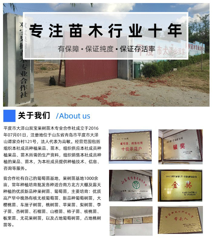 本合作社设立在“中国葡萄之乡”平度市大泽山镇,集品种选育、技术研究示范推广于一体的研究所,拥有专业苗木生产基地和示范推广基地。