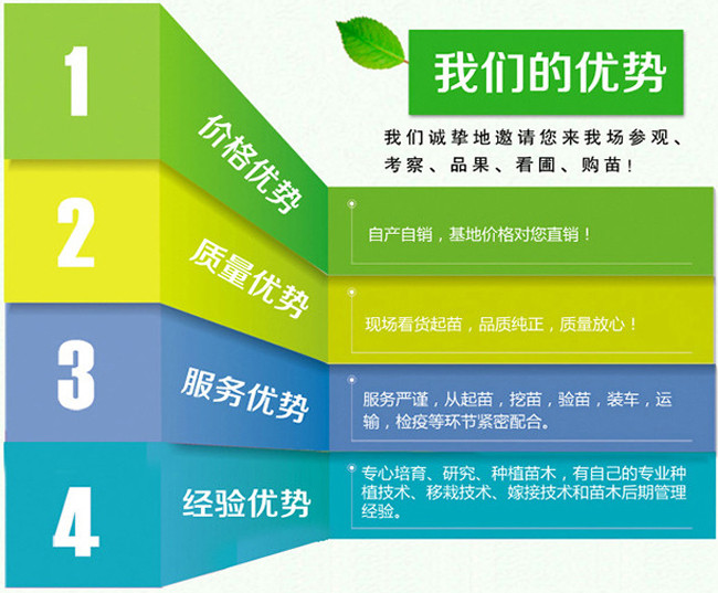 泰安开发区 绿荫园艺场 经销批发的草莓苗、蓝莓苗、无花果苗、核桃苗、樱桃苗、猕猴桃苗、桃树苗、梨树苗、柿子苗、山楂苗、香椿苗、石榴苗、李子苗、葡萄苗、杏树苗、花椒苗、各种果树苗、法桐苗、龙柏苗、各种绿化苗畅销消费者市场。我们秉承着品质保证,服务至上,诚信为本,物美价廉的宗旨,积极了解市场的动态,全面而准确的了解客户的需求。在消费者当中享有较高的地位,公司与多家零售商和代理商建立了长期稳定的合作关系。价格合理。泰安开发区绿荫园艺场实力雄厚,重信用、守合同、保证产品质量,以多品种经营特色和薄利多销的原则,赢得了广大客户的信任