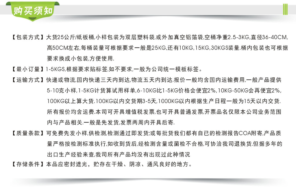 【包装储存】:25kg/桶,内衬两层无菌塑料袋,外套纸板桶。阴凉干燥处储存24个月