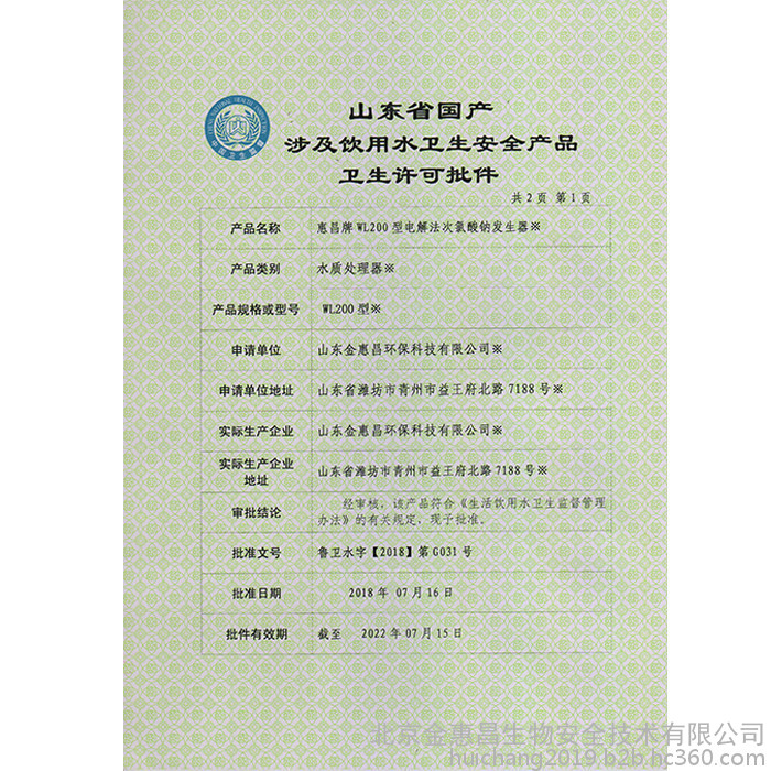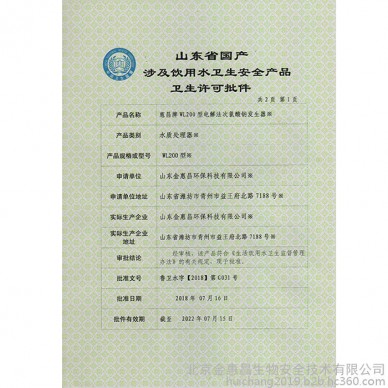 惠昌牌WL200型电解法次氯酸钠发生器取得了《涉及饮用水卫生安全产品卫生许可批件》。批准文号:鲁卫水字【2018】第G031号。经第三方检测机构检测:理化、微生物指标符合《生活饮用水用水标准》GB5749-2006和卫生部《生活饮用水消毒剂消毒设备卫生安全评价规范(试行)》2005规定得要求。经惠昌产品消毒后的污水细菌数量可以达到标准的排放标准。