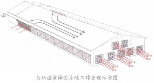 由湿帘、风机、循环水路和控制装置组成。在猪舍靠夏季主风向的一端安装湿帘及配套的水循环系统。在另一端安装轴流风机,整个猪舍密闭,除湿帘外不应有其他的进风口。