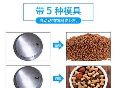 宠物饲料膨化机:该机为猫粮**等宠物专用饲料膨化设备。可生产多种花形,并可根据要求订做模具,产品出料口处配有变频调速的旋切装置,可任意调整刀片旋转速度,来控制切割的速度和长短。