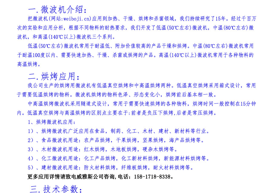 公司主页网址:www.weiboji.cn 微波机网址 //www.weiboji.com 威雅斯烘烤设备特点及应用 //www.weiboji.com/article/yy/UPS-4409.html 威雅斯烤虾设备 //www.weiboji.com/flash/20/377.html 威雅斯瓜子炒货机 //www.weiboji.com/flash/20/379.html 威雅斯茶叶烘干机 //www.weiboji.com/flash/20/380.html 威雅斯茶叶杀青机 //www.weiboji.com/flash/20/381.html 威雅斯枸杞烘干生产线 //www.weiboji.com/flash/20/390.html