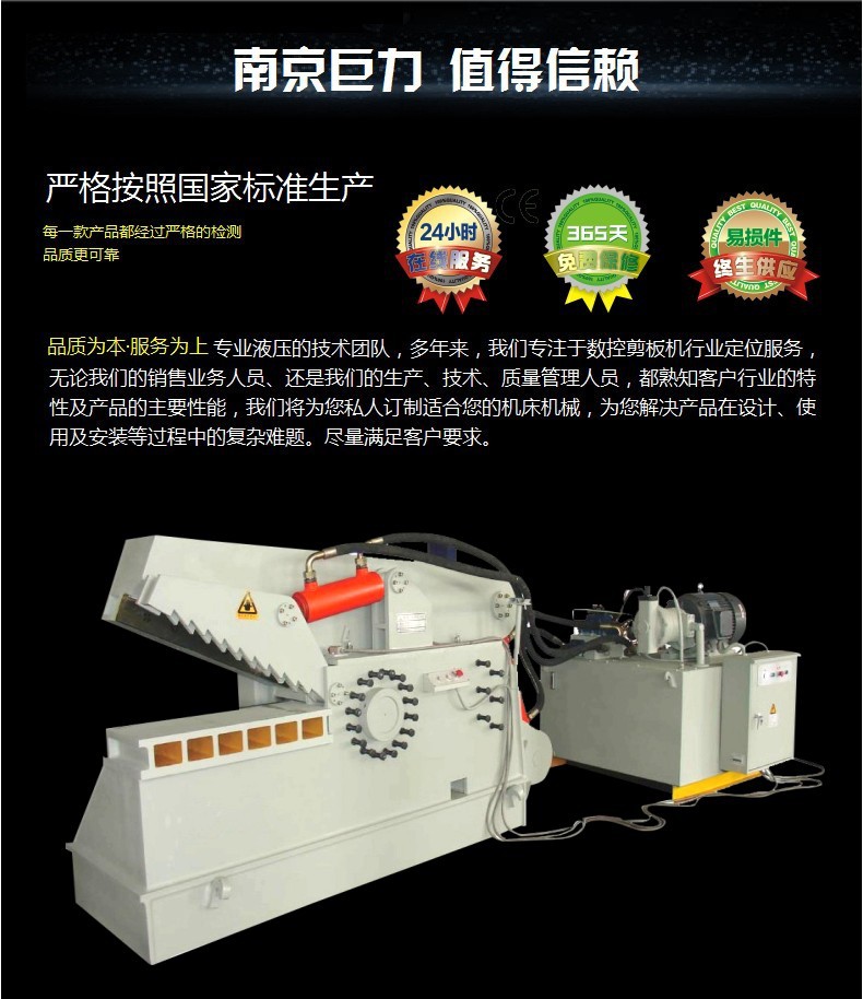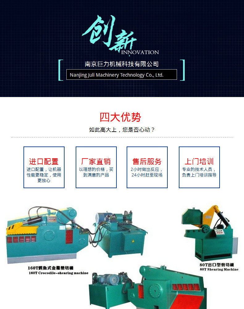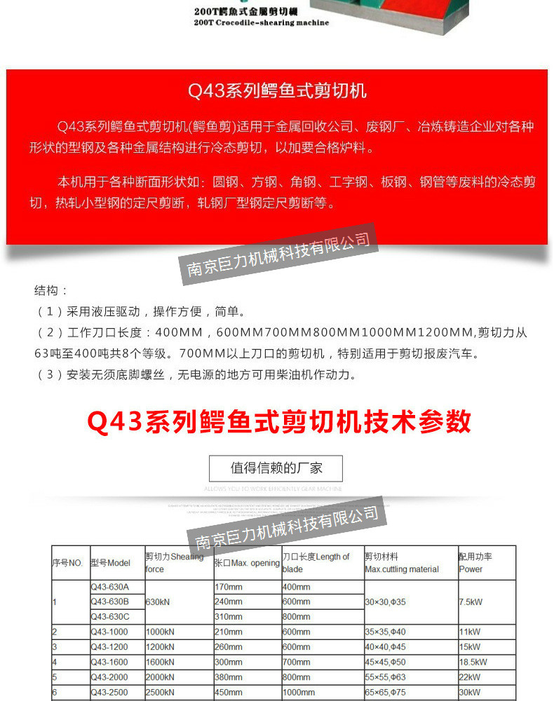 本网页所展示的有关【【南京巨力】鳄鱼剪切机/200吨鳄鱼剪切机报价/鳄鱼剪切机厂家_鳄鱼_南京巨力机械科技有限公司】的信息/图片/参数等由农产品之家的会员【南京巨力机械科技有限公司】提供,由农产品之家会员【南京巨力机械科技有限公司】自行对信息/图片/参数等的真实性、准确性和合法性负责,本平台(本网站)仅提供展示服务,请谨慎交易,因交易而产生的法律关系及法律纠纷由您自行协商解决,本平台(本网站)对此不承担任何责任。您在本网页可以浏览【【南京巨力】鳄鱼剪切机/200吨鳄鱼剪切机报价/鳄鱼剪切机厂家_鳄鱼_南京巨力机械科技有限公司】有关的信息/图片/价格等及提供【【南京巨力】鳄鱼剪切机/200吨鳄鱼剪切机报价/鳄鱼剪切机厂家_鳄鱼_南京巨力机械科技有限公司】的商家公司简介、联系方式等信息。