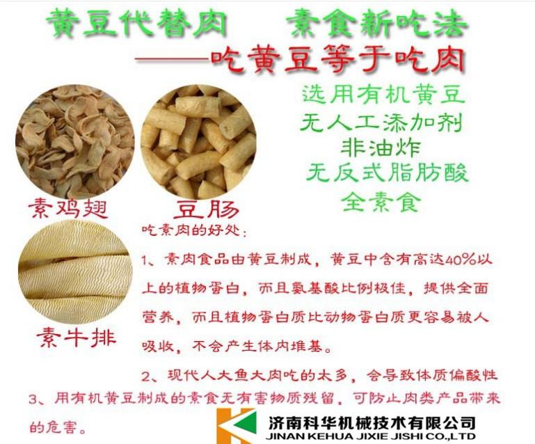 科华大豆蛋白挤出机是一机多用,可通过不同模具筒生产多种花样的食品,如:素牛排、素鸡翅、素海螺、素肉条、素鸡脯肉、素肉丁、豆虾、豆肠、豆丝、豆花、豆筋等十多种产品,如用户需要其它新花样,可来我厂进行加工制作。 生产出来的产品可炒、烹、炖、炸、凉拌,还可用作麻辣小食品原料。