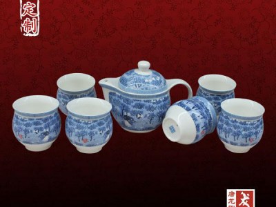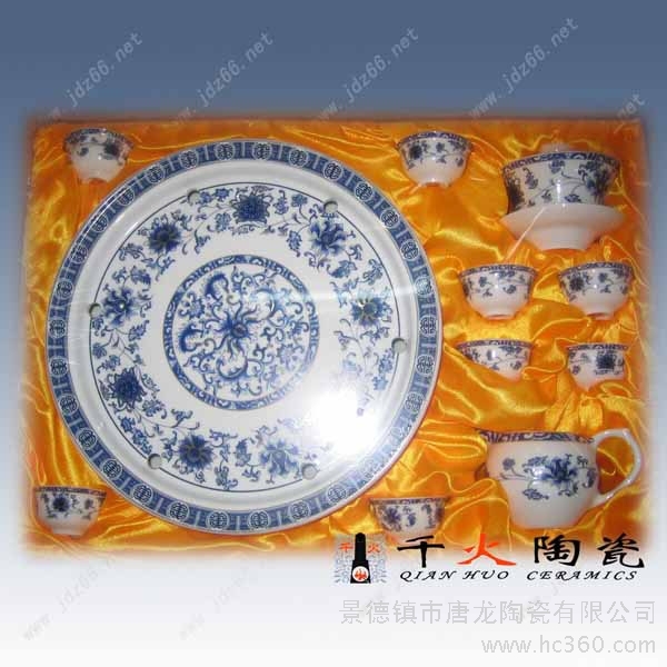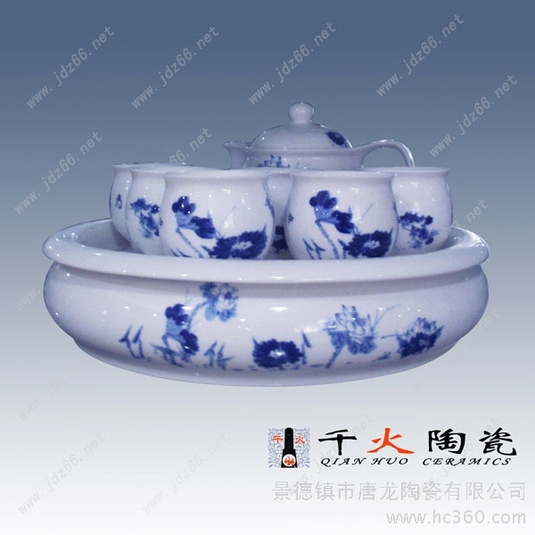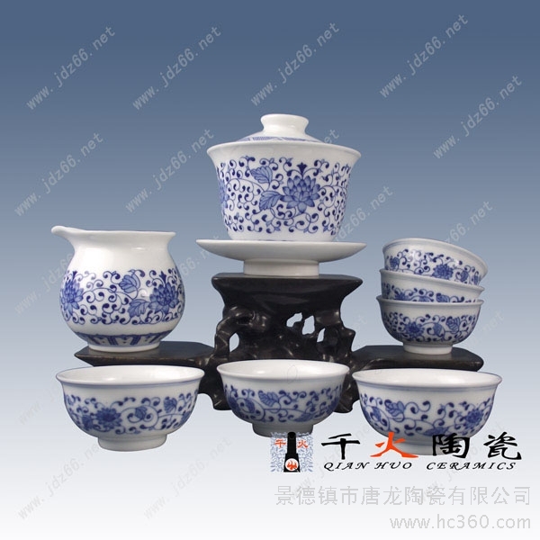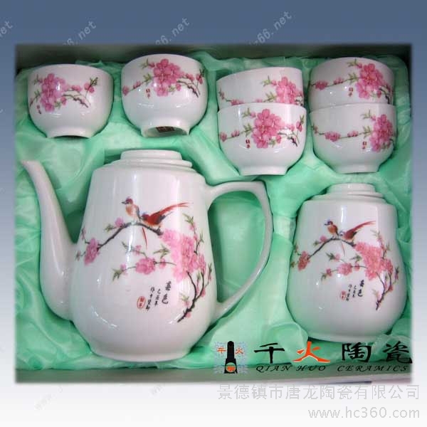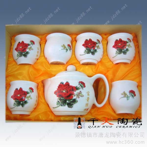 景德镇陶瓷厂家生产供应陶瓷茶具,手绘青花陶瓷茶具,手绘粉彩陶瓷茶具,中国红工艺品陶瓷茶具,功夫陶瓷茶具**礼品陶瓷茶具,时尚家居用品陶瓷茶具,陶瓷日用品陶瓷茶具,家居礼品陶瓷茶具,骨瓷陶瓷茶具,定做礼品陶瓷茶具,员工福利礼品陶瓷茶具。 饮茶离不开茶具,陶瓷茶具是指泡饮茶叶的专门器具,包括壶,碗,杯,盘,托等,古人讲究饮茶之道的另一个重要表现,是非常注重茶具的本身的艺术,一套精致的陶瓷茶具配合色,香,味三绝的名茶,可谓相得益彰。随着饮茶之风的兴盛以及各个时代饮茶风俗的演变,茶具的品种越来越多。 我公司生产的景德镇陶瓷茶具造型优美、品种繁多、装饰丰富、风格独特。瓷质"白如玉、明如镜、薄如纸、声如磬"。有手绘青花、粉彩、玲珑、颜色釉各种样式。还可以根据您的需要印制您需要的各种图片、添加公司LOGO图形和文字等。 景德镇唐龙陶瓷有限公司:作为一家植根与千年瓷都景德镇的陶瓷企业,我公司生产加工的礼品工艺陶瓷产品全部为**工艺美术师精心设计,经过1300度以上高温烧制而成的精美陶瓷艺术礼品,永不褪色变色。是温馨相送、友谊联络、喜庆贺礼、工商馈赠、师生情谊、敬意表达、励志名言及节日纪念等传达非凡感受的**礼物。选择唐龙,品质的保证;欢迎各界有识之士光临我公司参观指导!(出厂价供货,价格**优!) 同时我公司还提供各类陶瓷工艺品、陶瓷纪念品、陶瓷礼品的设计加工和来样定做。