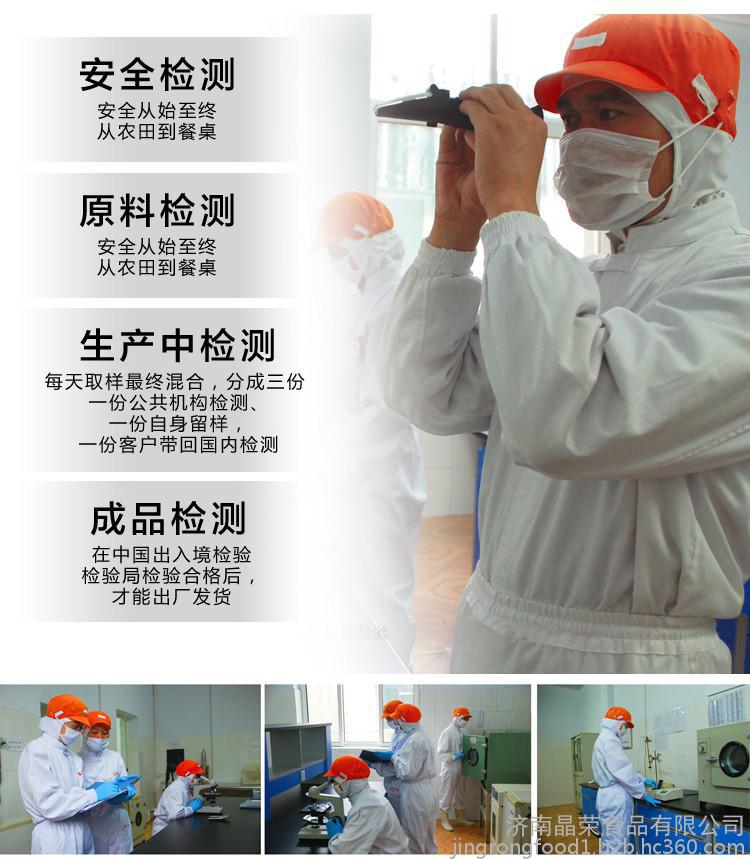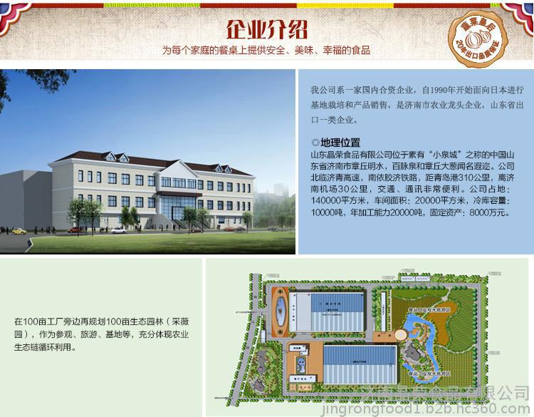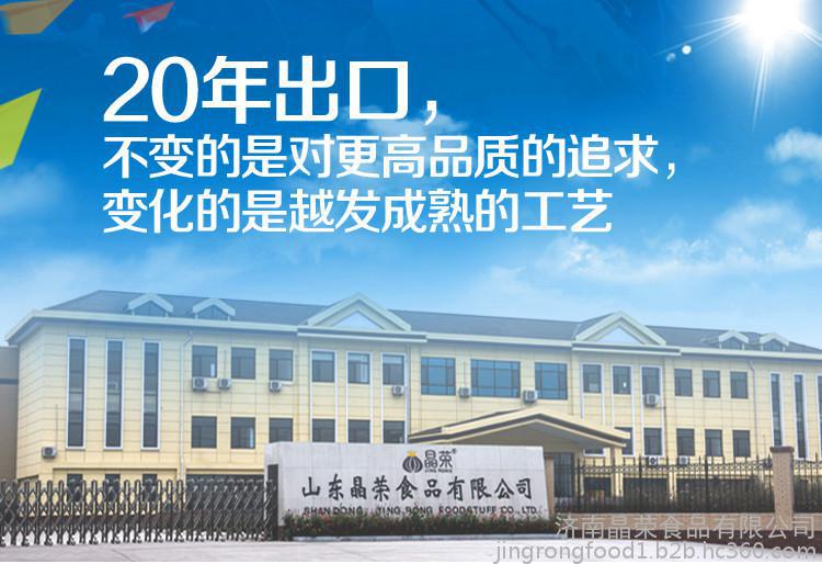 欢迎来到山东晶荣食品有限公司网站, 具体地址是山东省济南章丘市山东省济南市章丘区赭山工业园柳岗路388号,联系人是伊文浩。 联系电话是0531-83268852,联系手机是15615616063,主要经营公司产品集冷冻、干燥、腌渍、保鲜于一体,以各类蔬菜、水果及食用菌的深加工为主,产品的市场有日本、韩国、欧美等**。目前公司有两个工场,主要产品有冷冻浓缩圆葱、浓缩食用菌、各类冷冻水果、辣椒及辣椒叶制品、干燥圆葱、干燥蒜片及其它干燥蔬菜等,年加工能力4000吨。。 单位注册资金单位注册资金人民币 5000 万元。 本公司主要供应洋葱酱辣椒酱系列,速冻水果蔬菜系列,辣椒粉辣椒圈辣椒干等,出口级蒜片蒜粉,姜片姜粉姜干系列,脱水蔬菜脱水葱等,秉承“顾客至上,锐意进取”的经营理念,坚持“客户**”的原则为广大客户提供优质的服务。选择我们的理由——因为专业,所以信任!公司全体员工热忱欢迎各界朋友来电函洽谈业务!