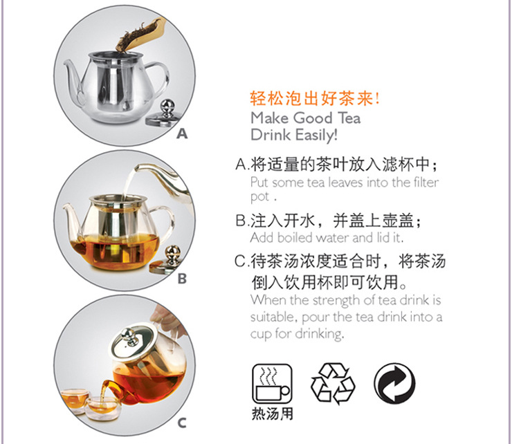 2:不休钢内胆独特的卡位设计,壶身与内胆结合在一起,倒茶是单手即可,不像传统的玻璃壶需要另一只手按住壶盖及内胆以防掉落,使用更加舒心。