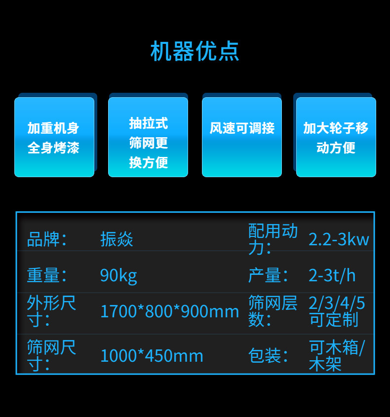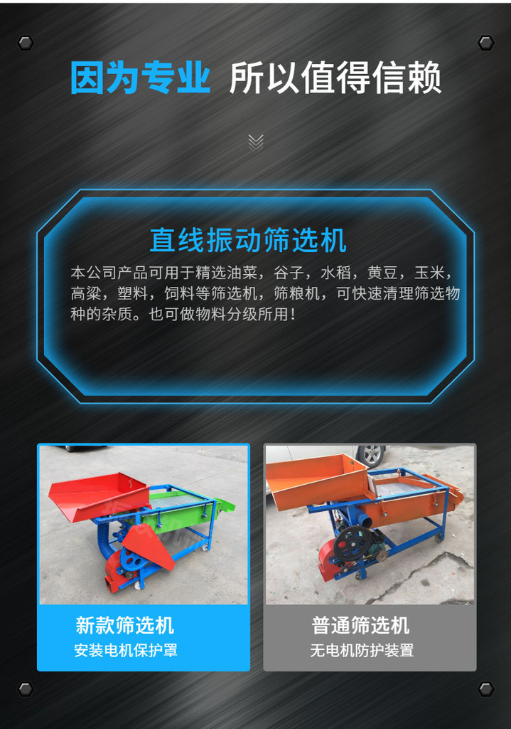 振焱筛选机常用粮食种子的精选、分级和除杂,适合广大种粮收粮大户和饲料加工厂使用。也可用于化工颗粒,锯末,田螺、山茶籽、黄粉虫等物料的分级除杂。