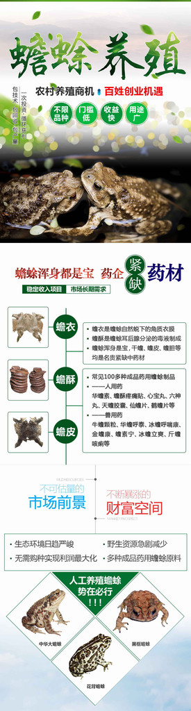 蟾蜍制品国内外市场需求日益增长,决定了蟾蜍制品不断暴涨的财富空间,数百种中成药原材料用到蟾蜍制品。 目前国内供应量仅能达到市场需求量的23%,满足出口量的50%,可见其价格仍有上涨趋势。据统计:市场蟾衣和蟾王酥平均价格呈上涨趋势,质量越好,收购价格相对会高,蟾蜍养殖前景及效益十分可观。