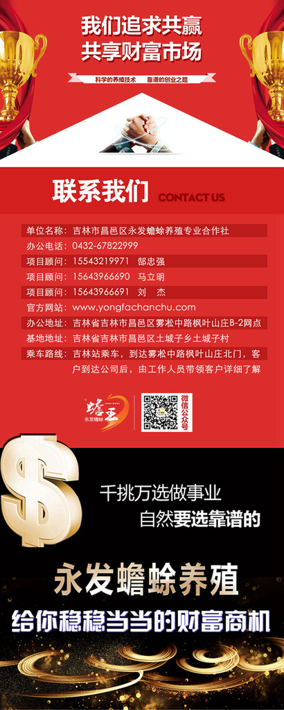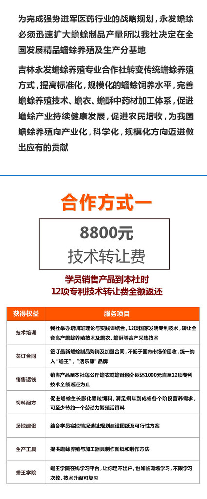 蟾蜍类制品为原料已制成数百种抗癌原料,药企需要蟾王酥或蟾衣作为原材料生产成品药,每个制药企业年需求量约500公斤,保守计算中国制药企业年需求量达50吨,国外药企需求量约10吨。保守计算按每个养殖户年产10公斤蟾王酥,需建立5000个与吉林永发蟾蜍合作的养殖户能满足国内制药企业1年的需求量。我们期待有更多的合作伙伴加入我们,为消费者提供更多高品质的蟾蜍制品,为众多癌症患者带来福音。